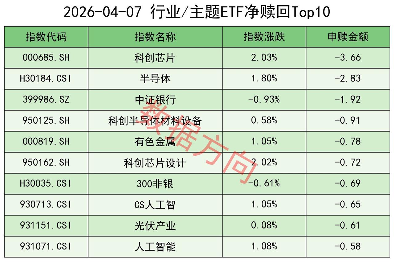 科创芯片指数(-3.66亿)、半导体指数(-2.83亿)、科创半导体材料设备指数(-0.91亿)、科创芯片设计指数(-0.72亿),一起进入赎回榜。
