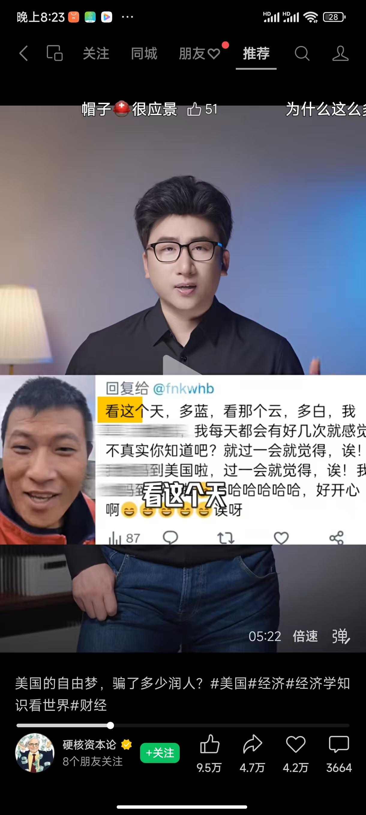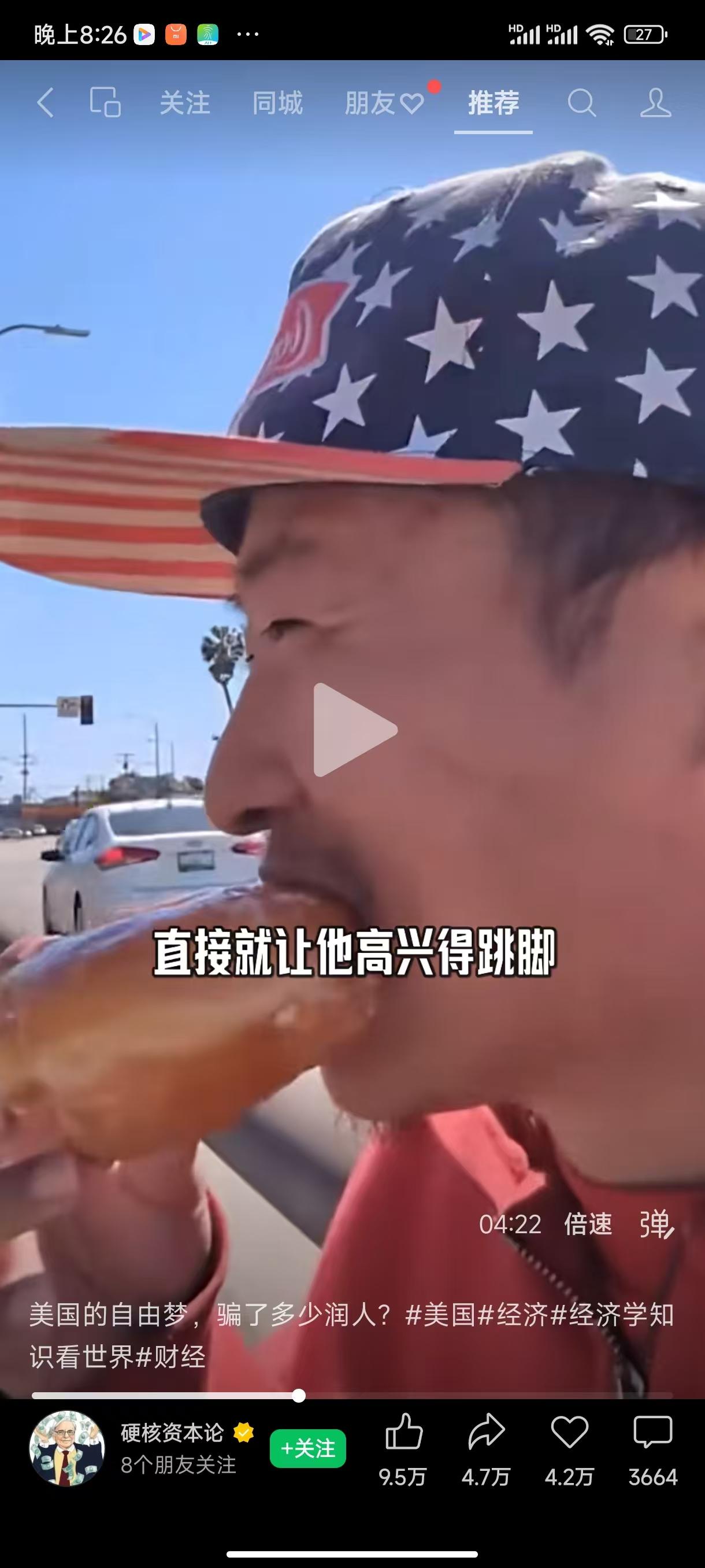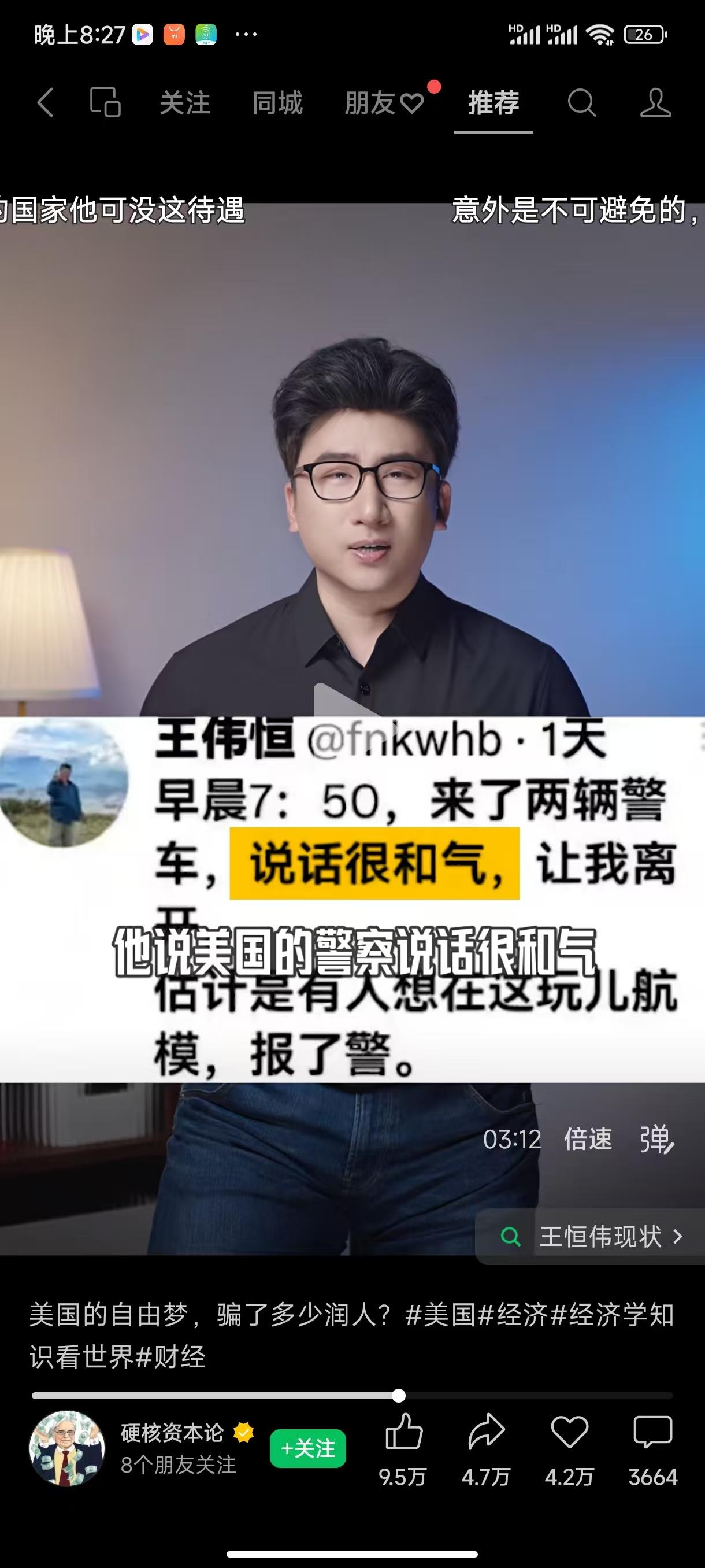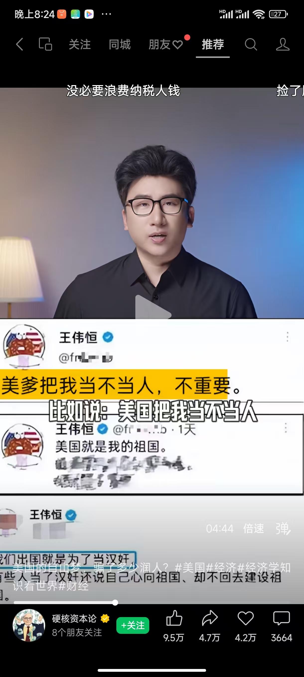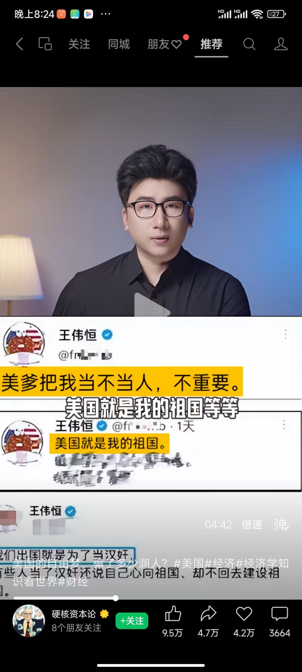 声称他到美国就是为了当汉奸。到了美利坚第一件事就是吹捧那里的天有多蓝,云有多白,人家多给一个甜甜圈也是那里政府有多么温暖,就连警察驱赶他都说漂亮国警察办案有温度。