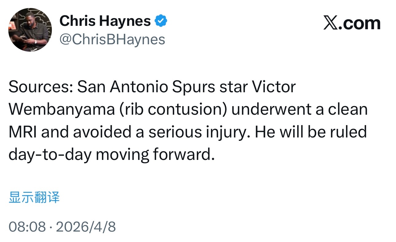 Chris Haynes:文班亚马(肋骨挫伤)的核磁共振检查结果正常,没有出现严重伤情,他接下来的状态将每日观察。