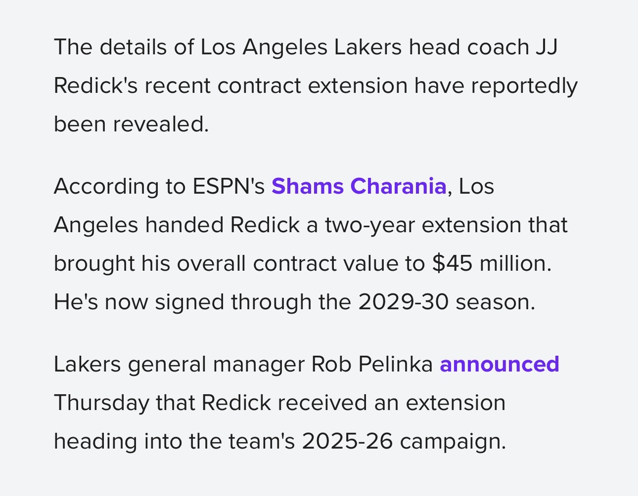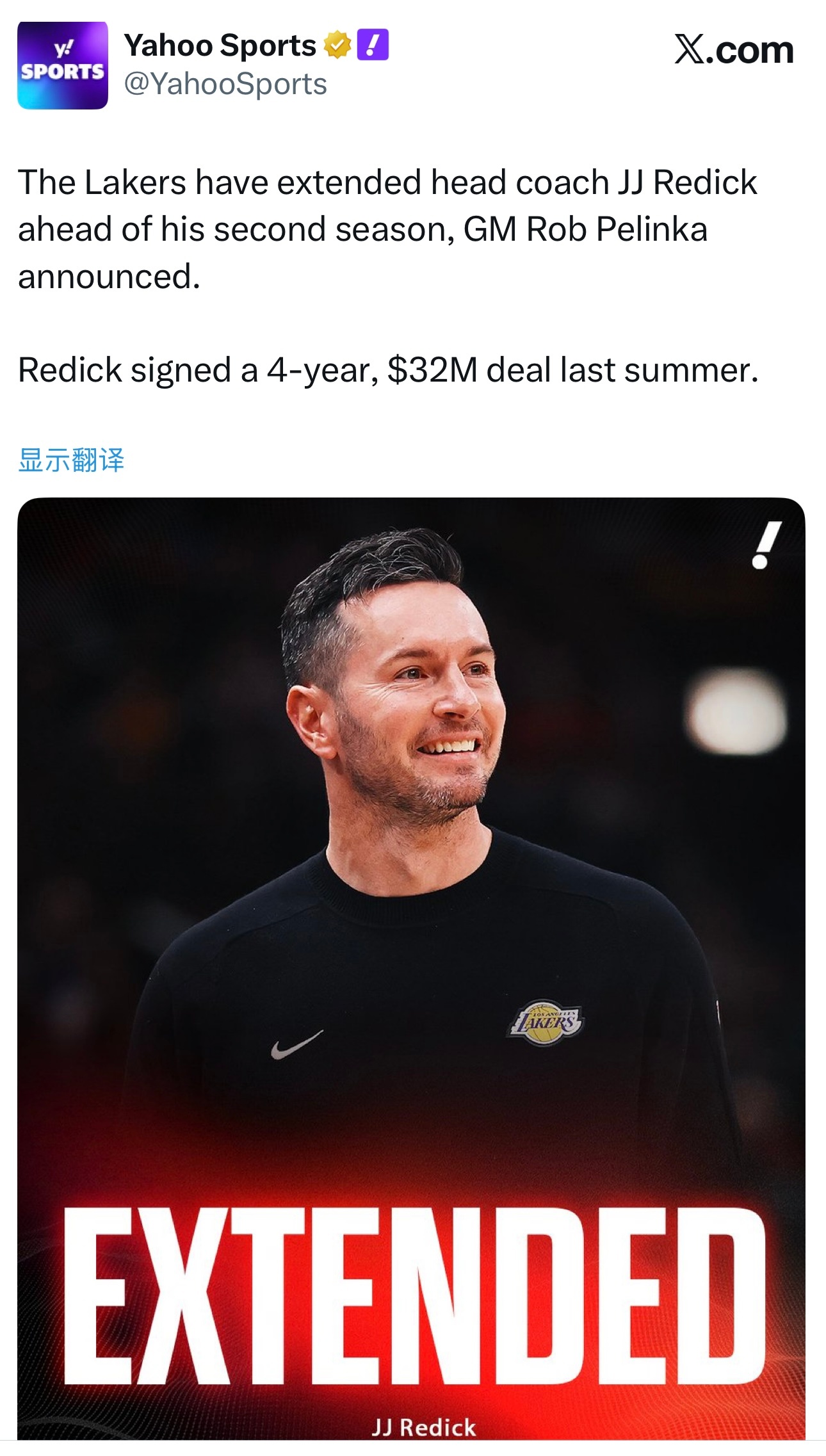 2024年6月,湖人与JJ雷迪克签下4年3200万美元合同,去年夏天与他续约了2年2100万,合同直到2029-30赛季结束,雷迪克在这5年间能拿到4500万美元。