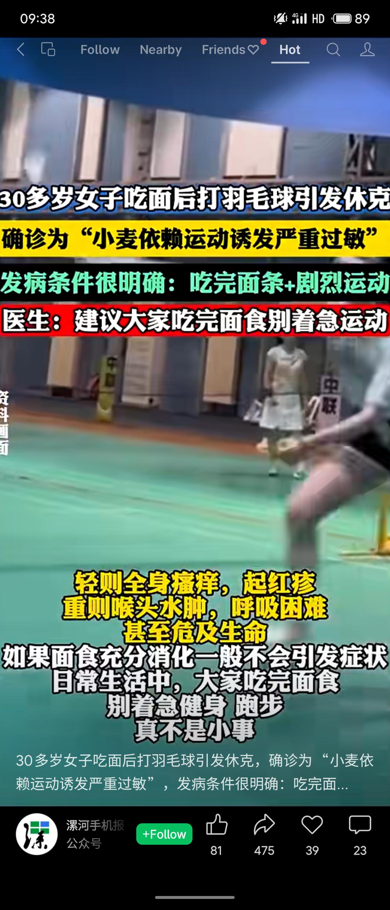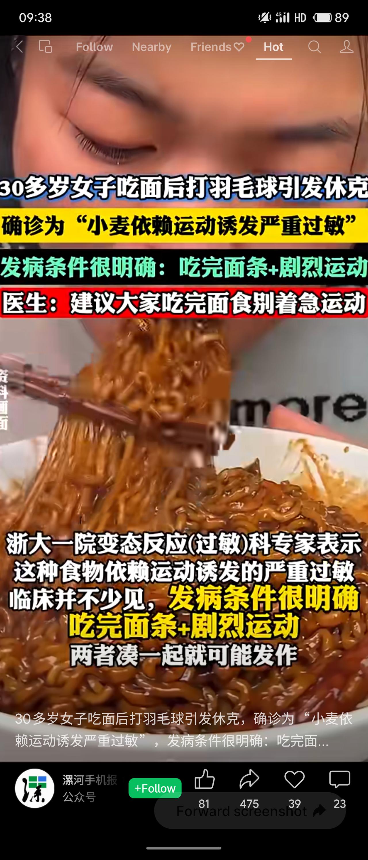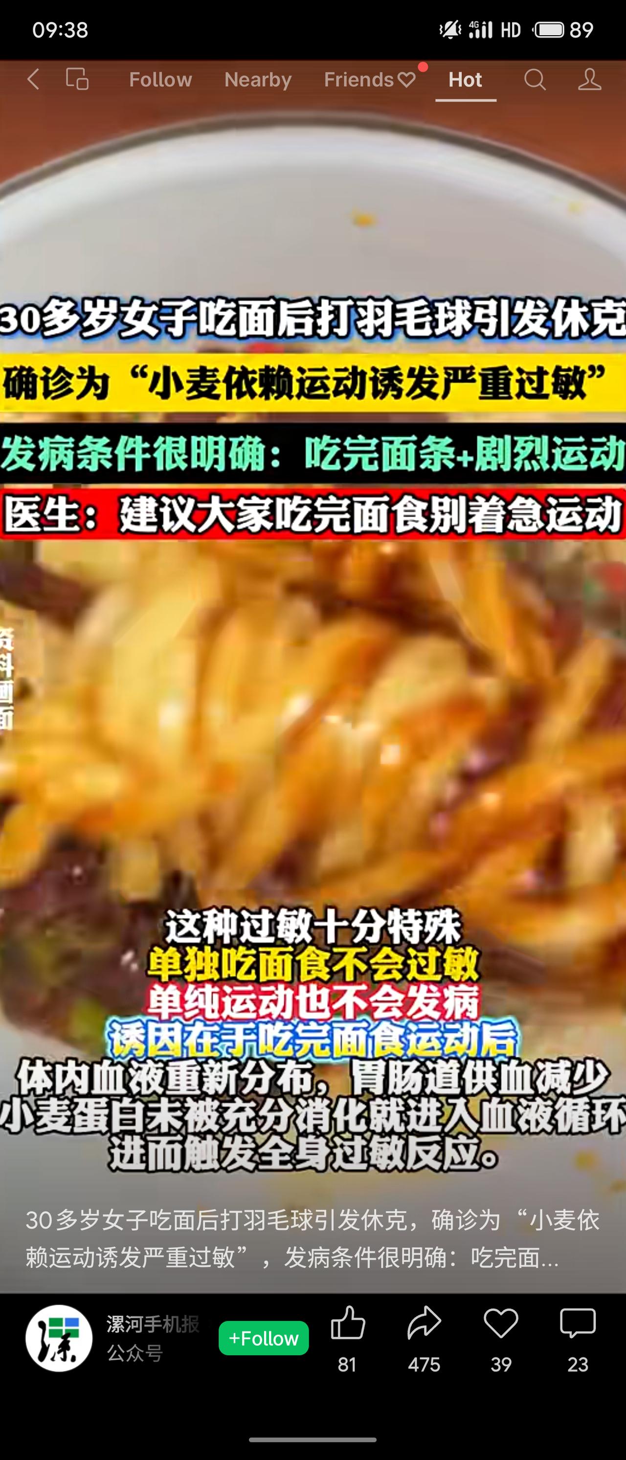 30多岁女子吃面后打羽毛球引发休克,确诊为“小麦依赖运动诱发严重过敏”。发病条件明确:吃完面食+剧烈运动。单独吃面或单独运动均无碍,但运动后血液重新分布,未消化的小麦蛋白进入血液,触发过敏,轻则红疹,重则喉头水肿休克。医生提醒:吃完面食别急着运动。