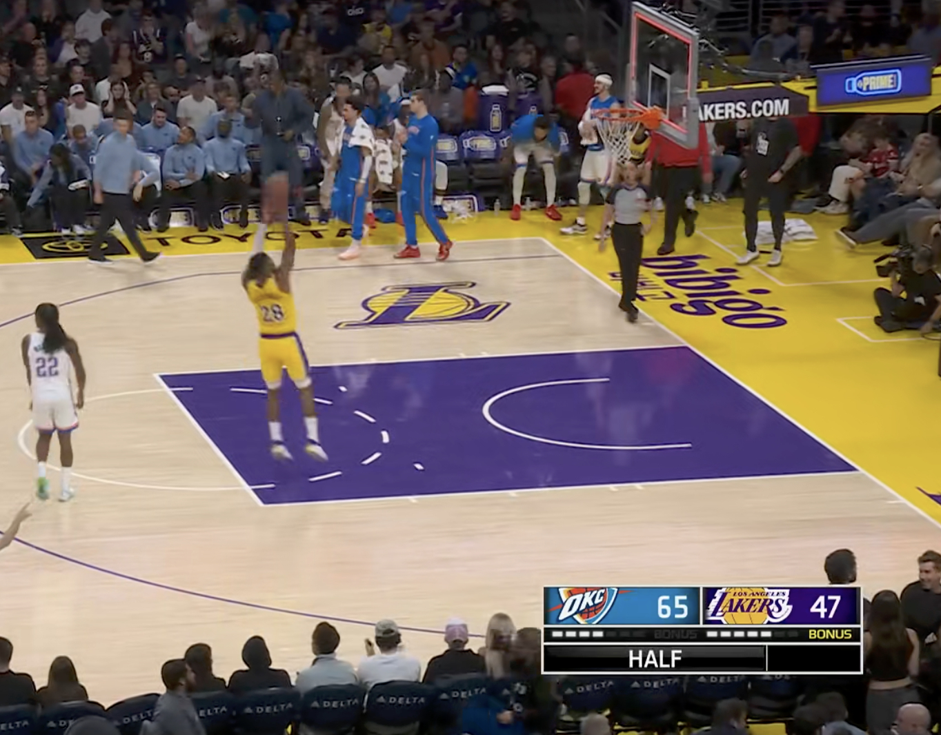 半场结束,湖人47-65雷霆,如何评价?雷霆vs湖人