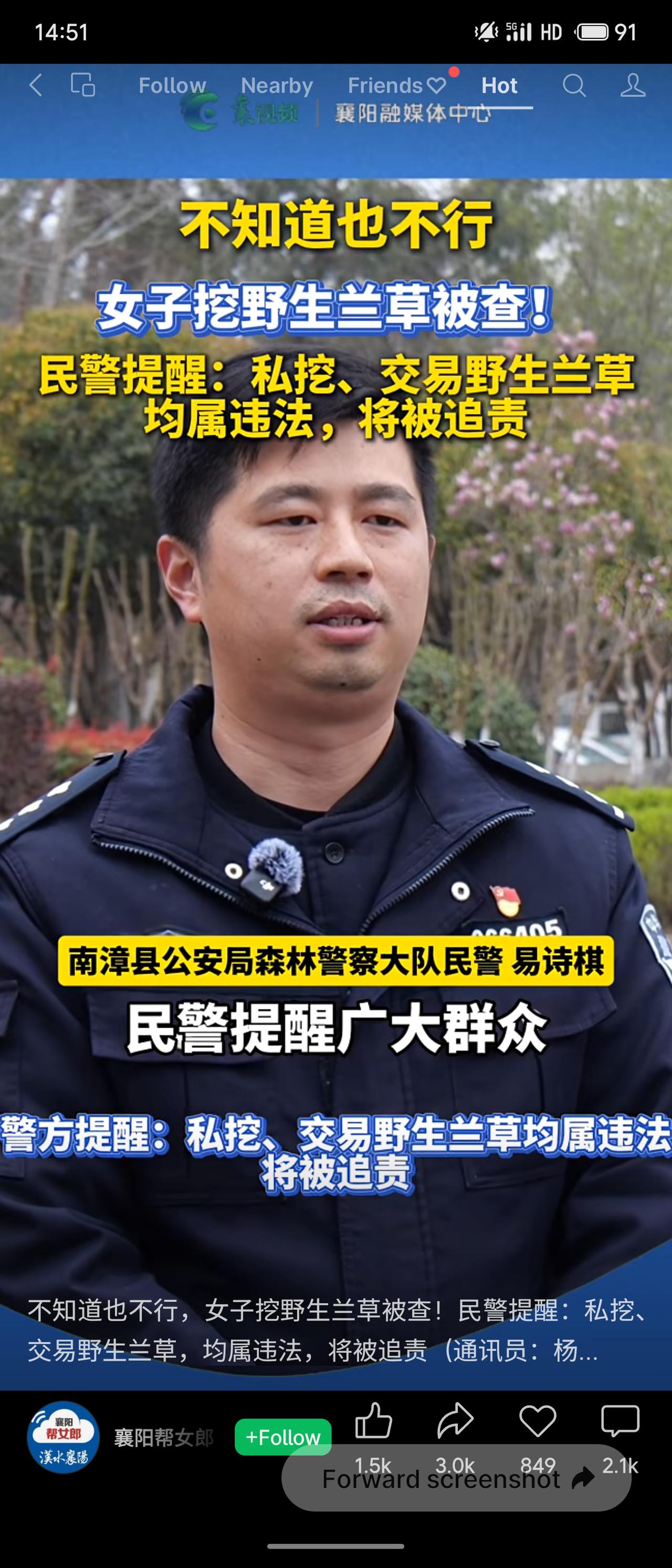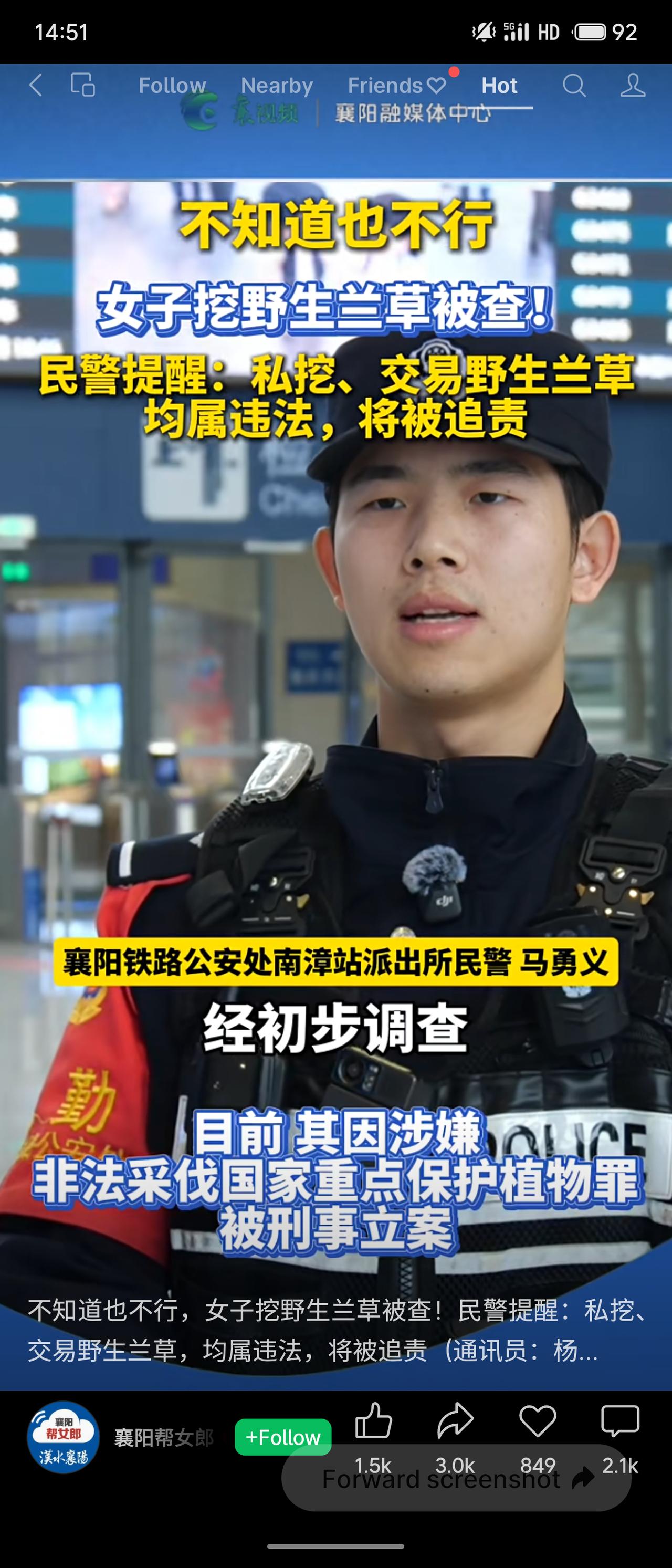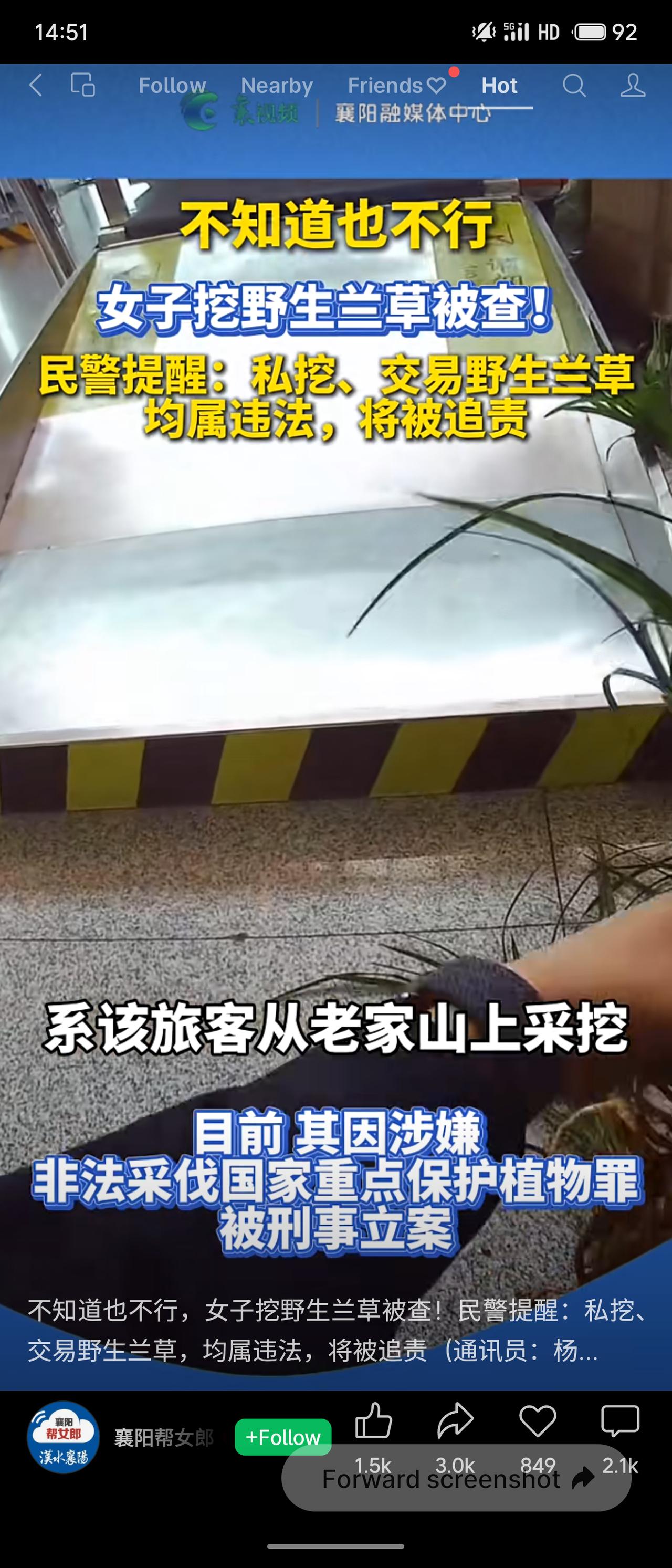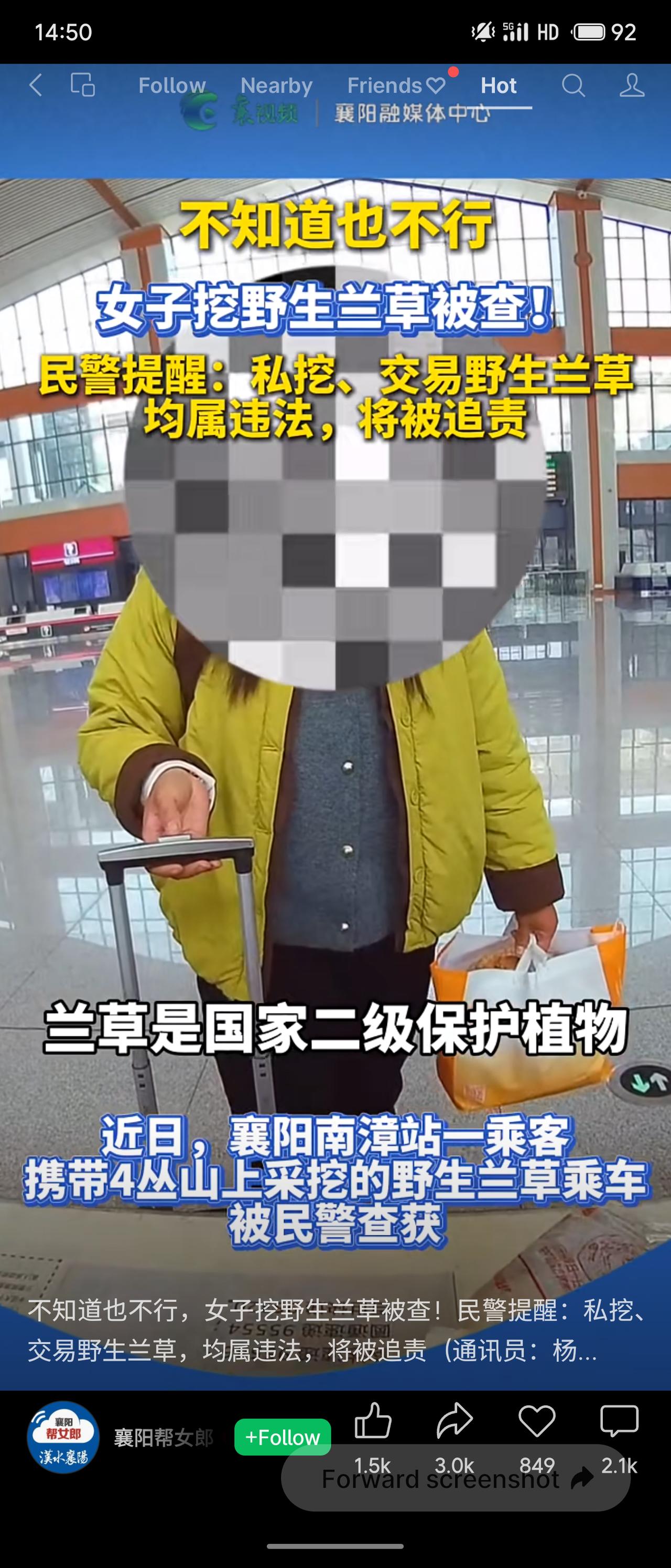 湖北南漳一女子在车站携带4丛野生兰草被查,自称“不知道”违法。民警指出,野生兰草为国家二级保护植物,私挖、交易均属违法。该女子因涉嫌非法采伐国家重点保护植物罪被刑事立案。