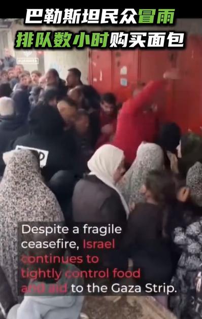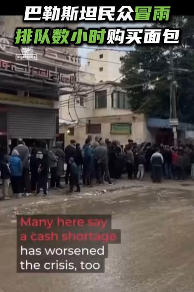 巴勒斯坦民众冒雨排队买面包 !