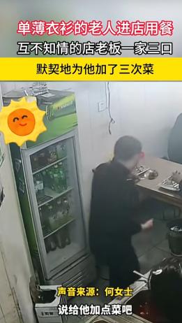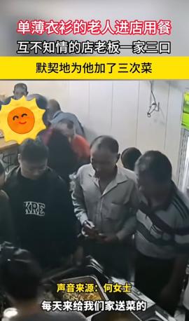 江苏南京,一老人去餐馆吃饭,老板的女儿看他老人年纪较大衣着单薄,便在给老人打菜时,多加了一些,过了一会,老板的妻子也看见了这位老人,也给老人加了菜,而店主在不知情的情况下,再次让女儿给老人加菜。