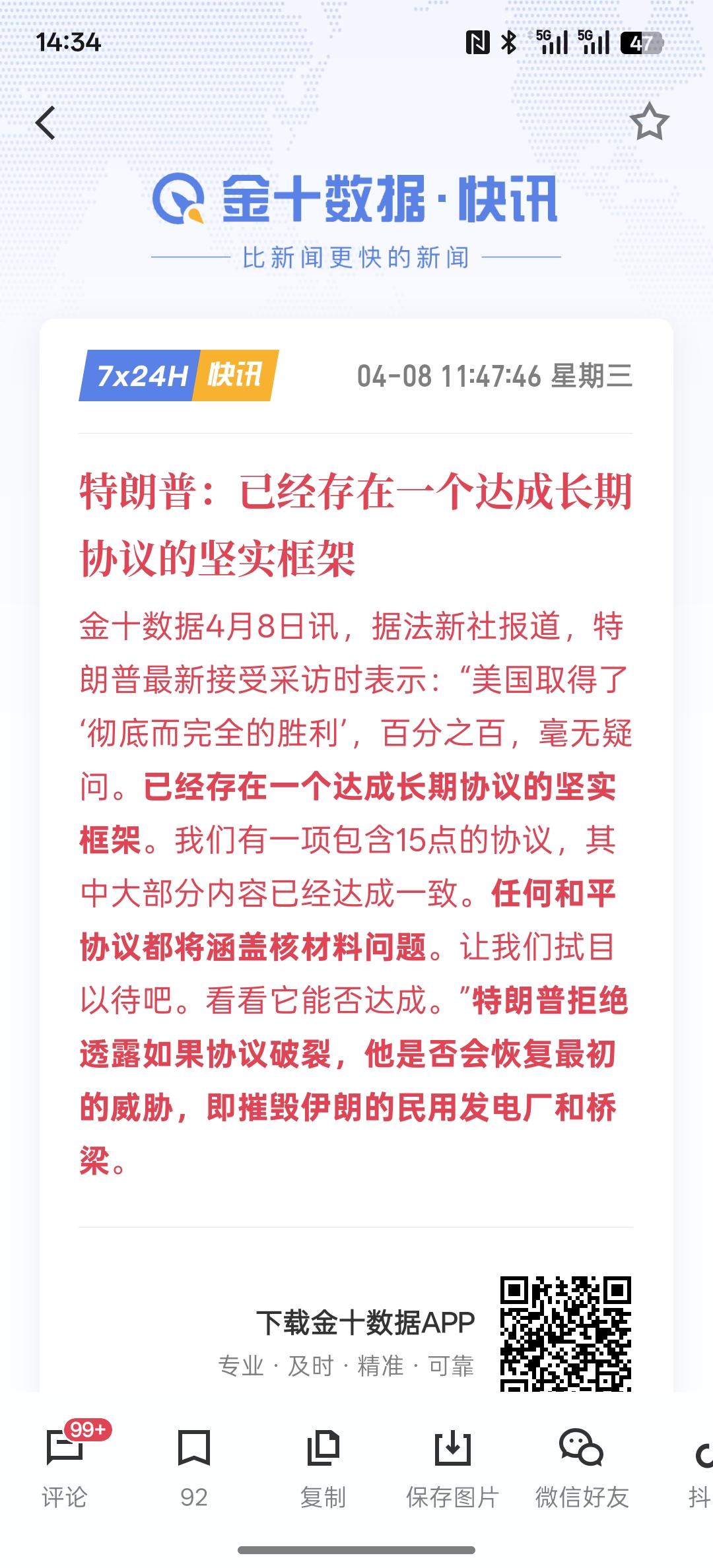 特朗普方面给出的消息是,已经存在一个达成长期协议的框架!接下来就看双方如何进行谈判。到目前为止,美国方面宣布自己赢了。伊朗方面宣布自己赢了,都说双方达成了自己的目标,那接下来谈判之间,那岂不是双赢的局面?