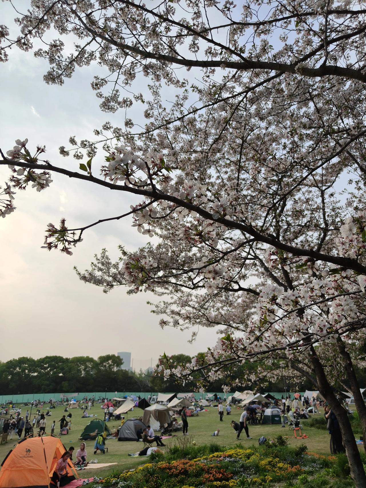 🌇夕阳西下,樱花🌸树下↓ 👨👩👦👦🏻休闲度假的人们👧🏻?