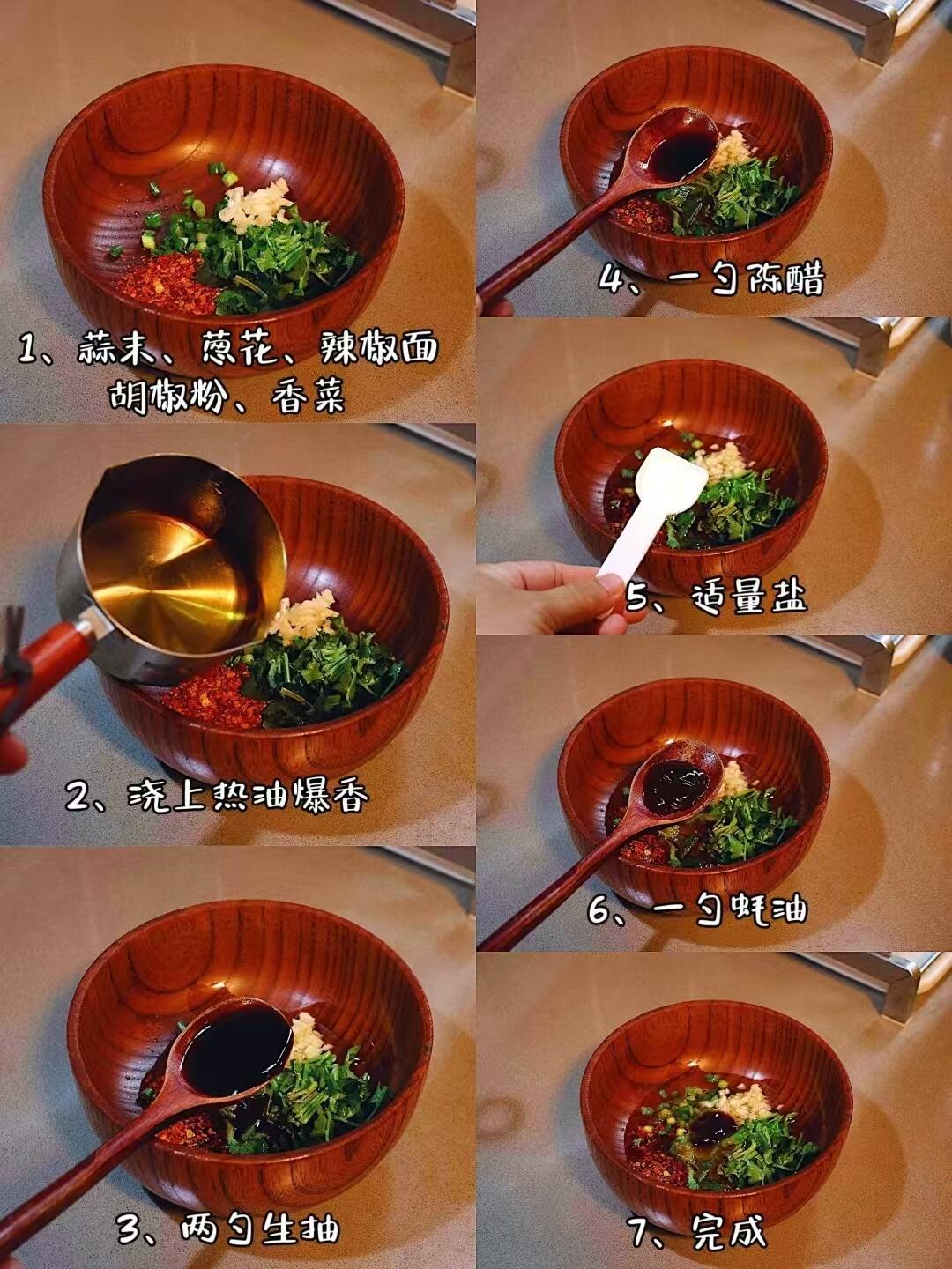 1️⃣ 调个灵魂料汁: 找个大碗,把蒜末、葱花、香菜、辣椒面、胡椒粉全都丢进去。烧一点热油,“滋啦”一声泼上去,瞬间香味就炸开了!这时候趁热加两勺生抽、一勺蚝油、一勺陈醋,再加一点点盐调味,底料就搞定啦。