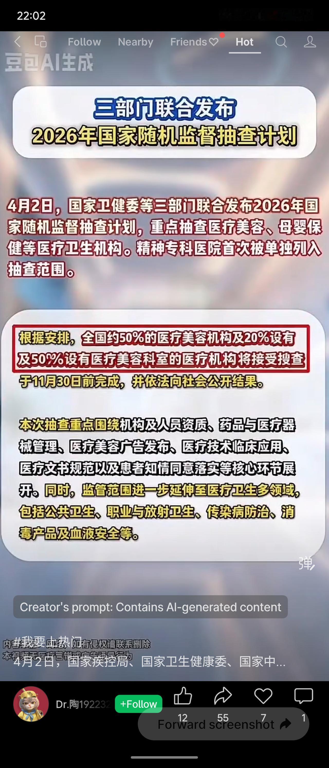 国家卫健、疾控和中医药管理局三部门于4月2日发布2026年国家随机监督抽查计划,重点抽查医美、母婴保健机构,精神专科医院首次被单独列入。全国约50%医美机构及20%设有医美科室的医疗机构将接受检查,11月30日前完成并公开结果。抽查聚焦资质、药械管理、广告发布、技术应用、文书规范及知情同意等环节。此举强化了重点领域监管,特别是精神专科的纳入填补了此前空白,有助于规范行业秩序、保障患者安全。