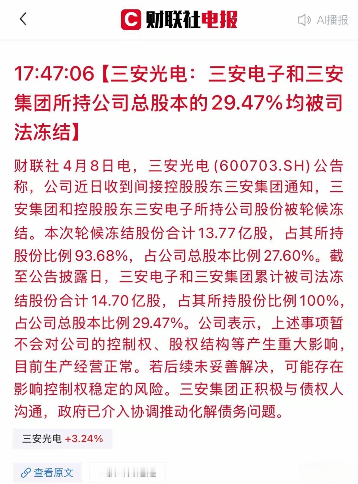 明天搞不好会出现较大幅度的下跌!三安电光,这是要爆雷了吗?副董事长兼总经理被留置,三安电子和三安集团所持有的公司总股本的百分之29.47股被司法冻结!如果没能妥善解决,可能存在影响控股稳定的风险!