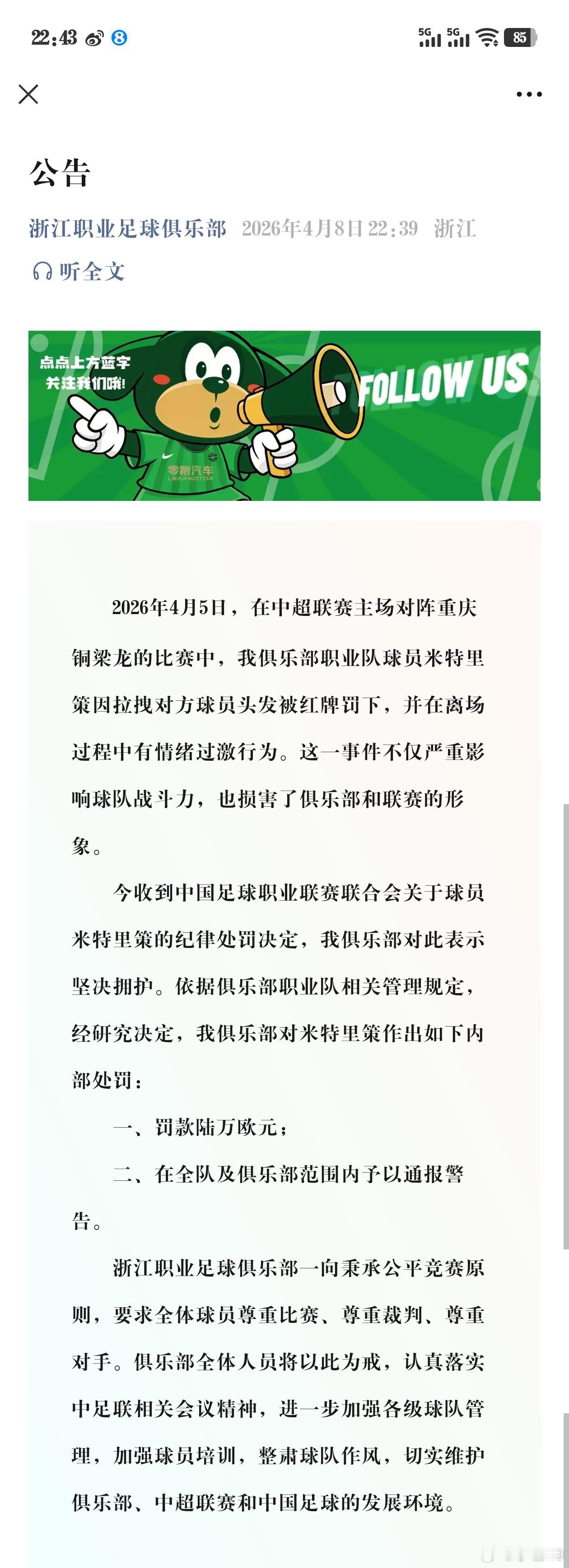 在中足联发布了对于米特里策的4场禁赛处罚之后,浙江俱乐部也对他进行了内部处罚,内