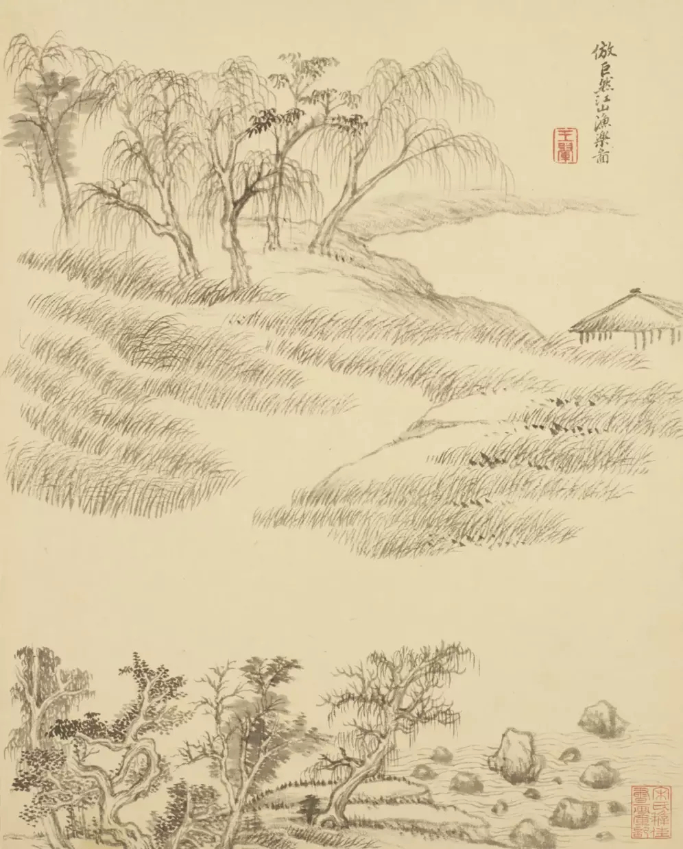 清 王翚 仿古山水册。全册十六开,其中第九开有“年已七十矣”一印,故知成于辛巳(