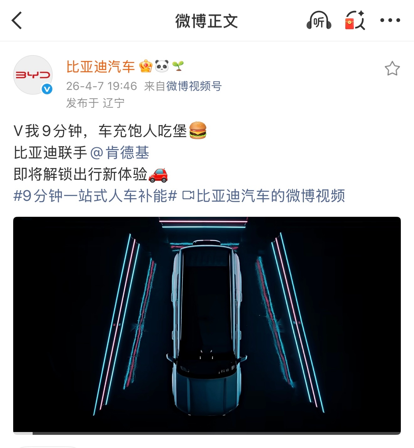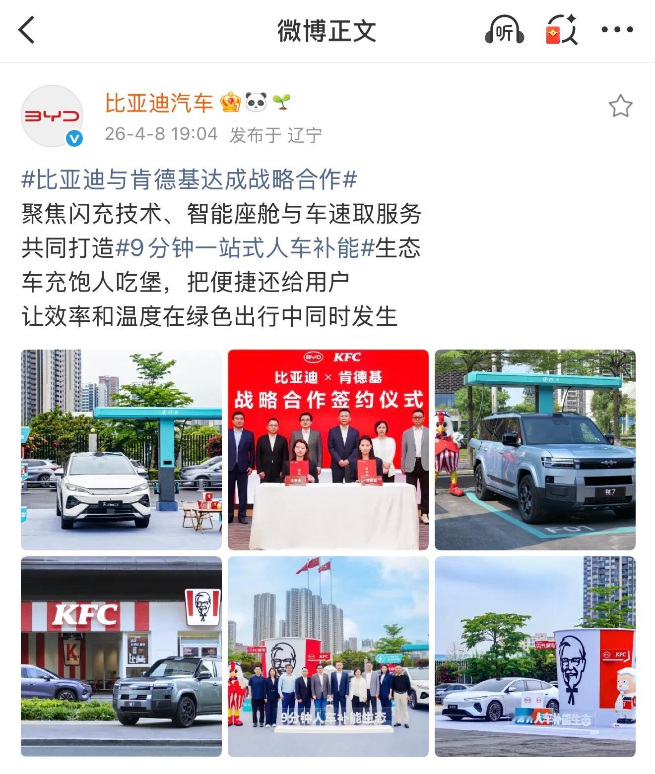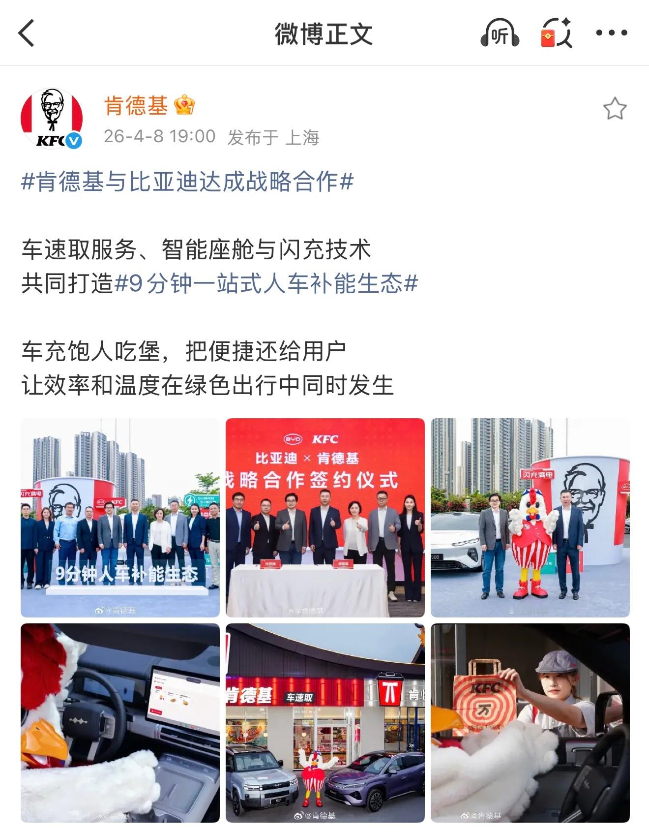 比亚迪&肯德基偷摸战略合作了以后吃鸡充电一条龙有点意思也有可能餐还没取到电就充满了