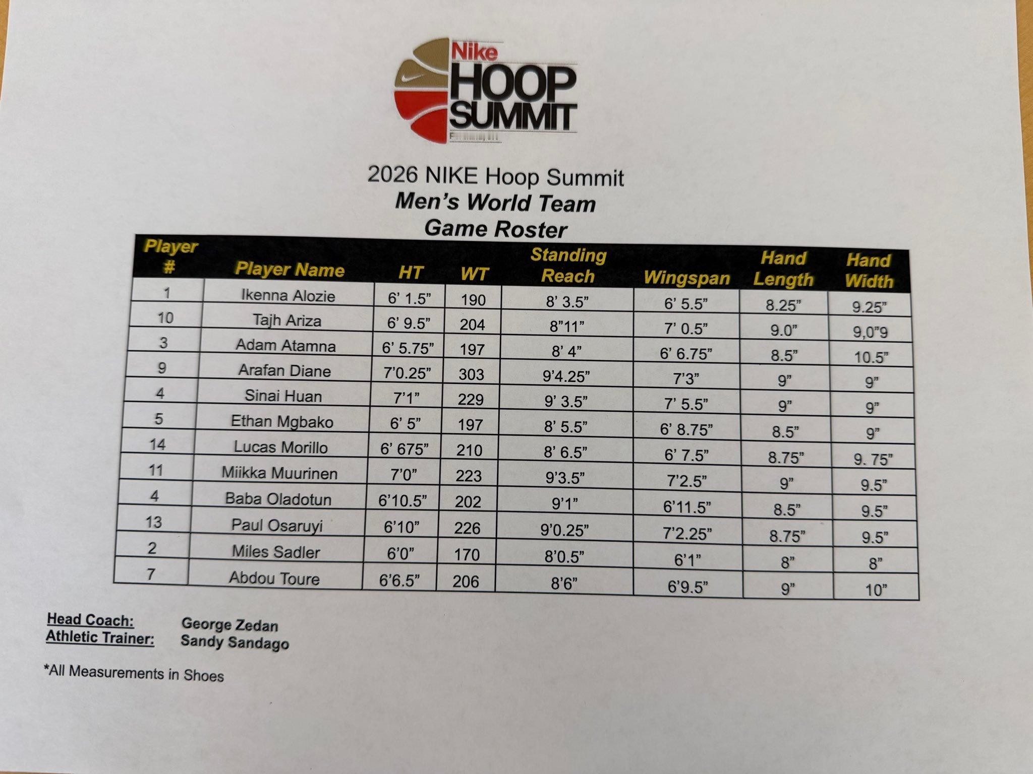 郇斯楠在2026耐克巅峰赛的体测数据:身高215.9cm臂展227.6cm站立摸