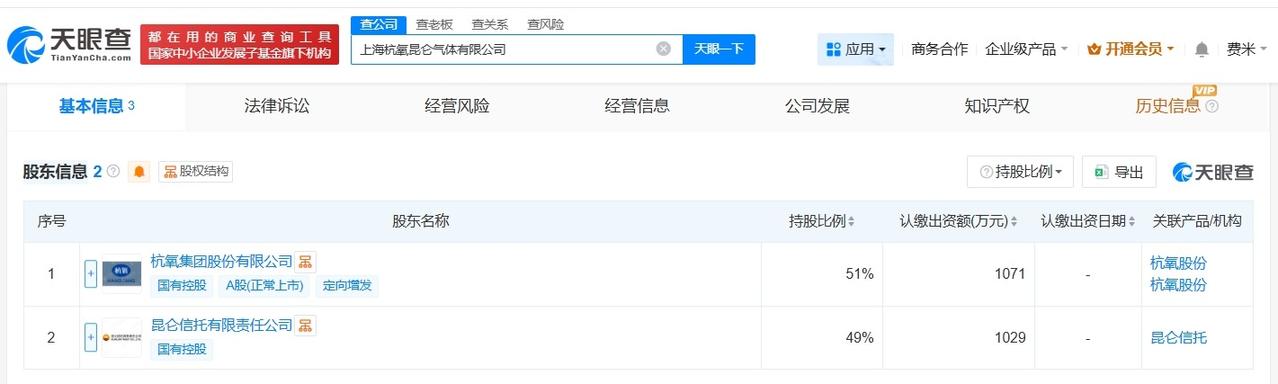 天眼查工商信息显示,近日,上海杭氧昆仑气体有限公司成立,法定代表人为盛林华,注册资本2100万人民币,经营范围包括气体、液体分离及纯净设备销售,气体压缩机械销售,站用加氢及储氢设施销售等。股东信息显示,该公司由杭氧股份(002430)、昆仑信托有限责任公司共同持股。