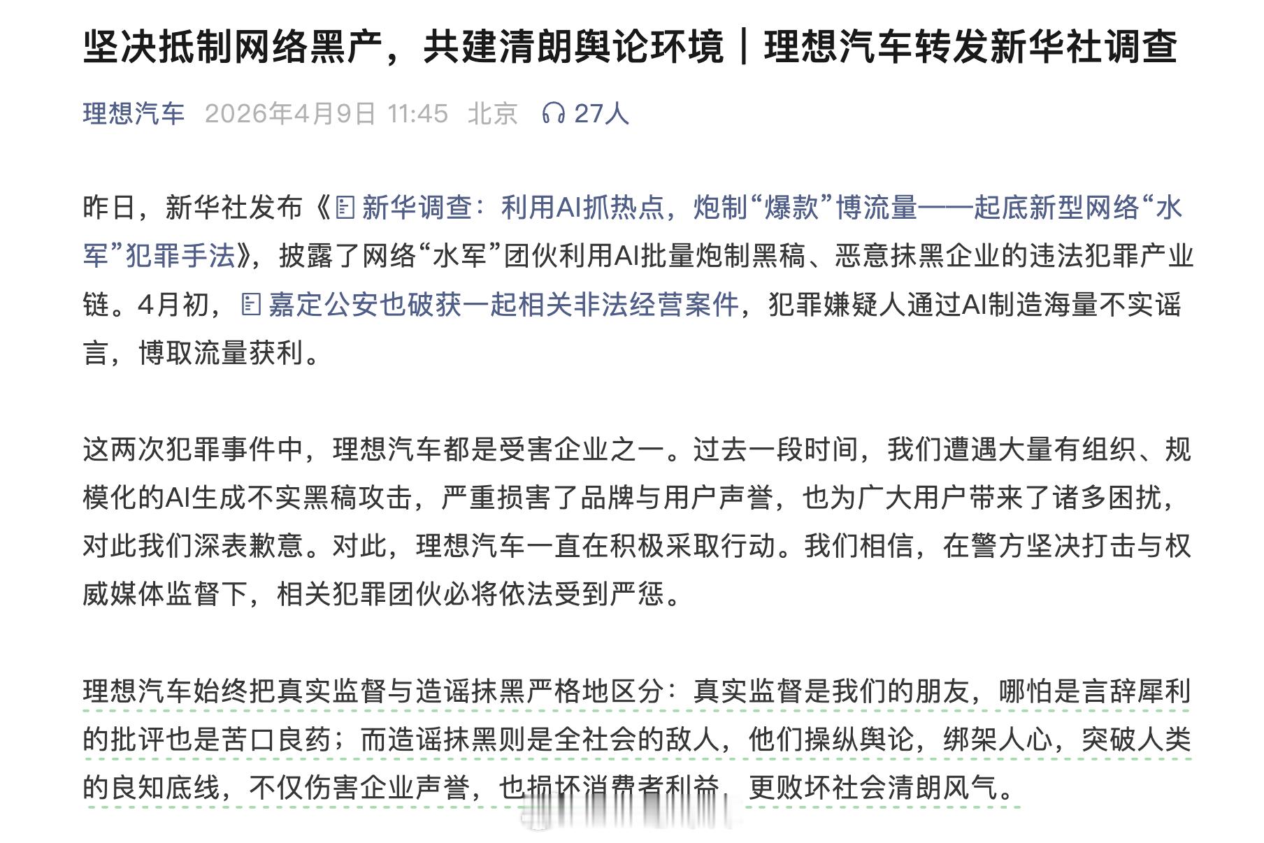 理想汽车转发了新华社对于 AI 水军恶意抹黑的调查,并表示是受害企业之一。