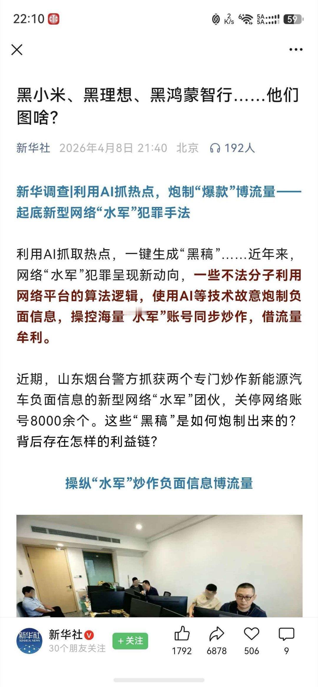 【山东烟台警方抓获新型网络“水军”团伙,利用 AI 编写涉鸿蒙智行 、 小米 、理想汽车等负面文章借流量牟利】
