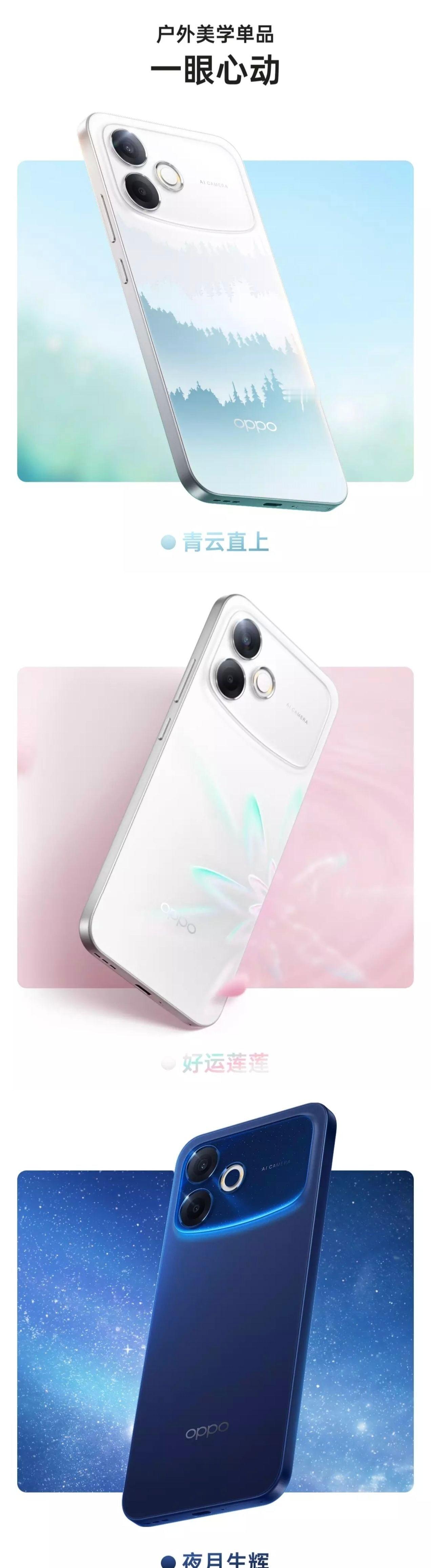 采用一体冷雕工艺Deco,3D景深光感工艺后盖,屏幕方面是6.57"1080P OLED直屏;续航拥有7000mAh电池。共有三款配色青云直上/好运莲莲/夜月生辉。