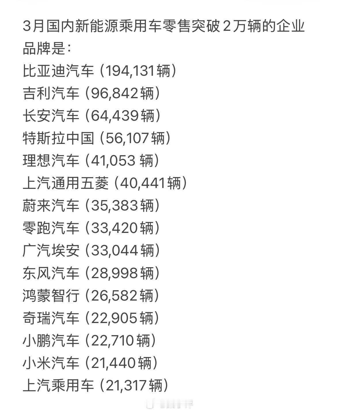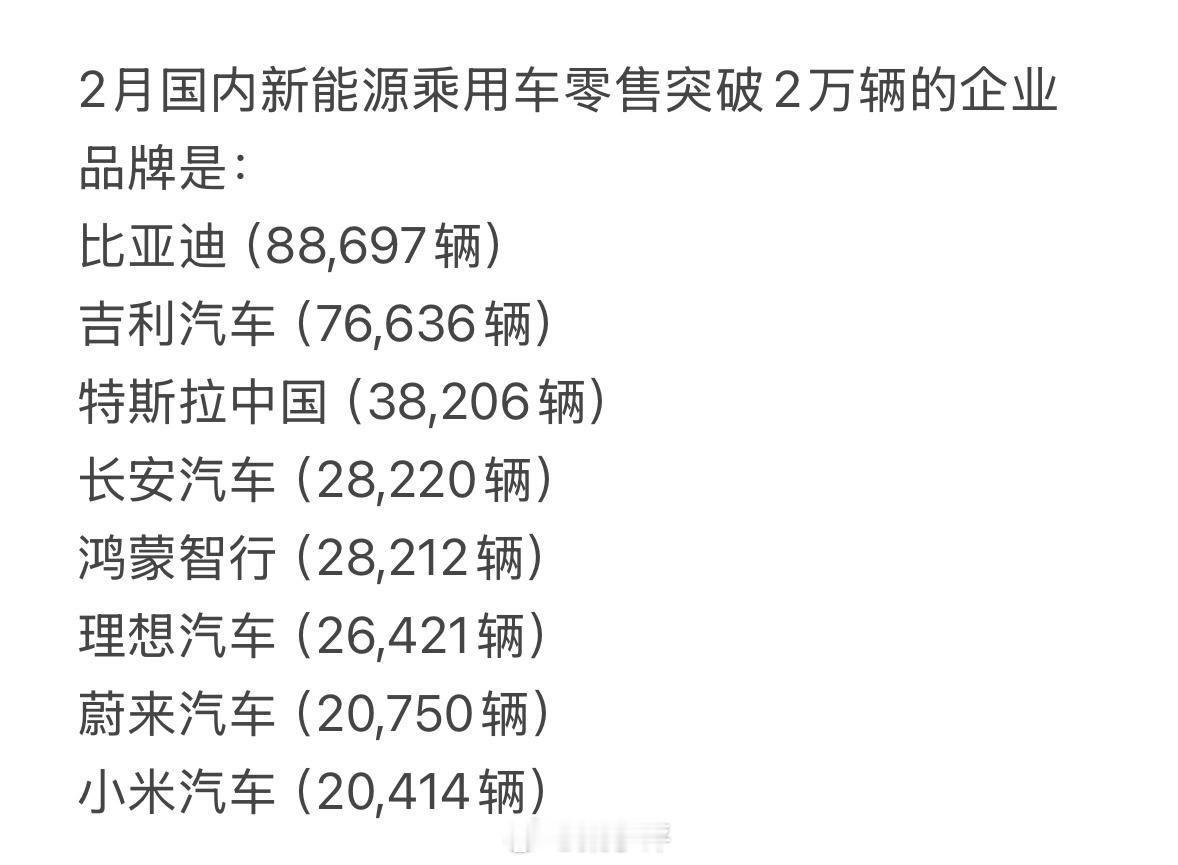 今年1-3月国内新能源乘用车零售销量TOP4品牌1、比亚迪,377004辆2、吉利,265613辆3、长安,123781辆4、鸿蒙智行,112709辆