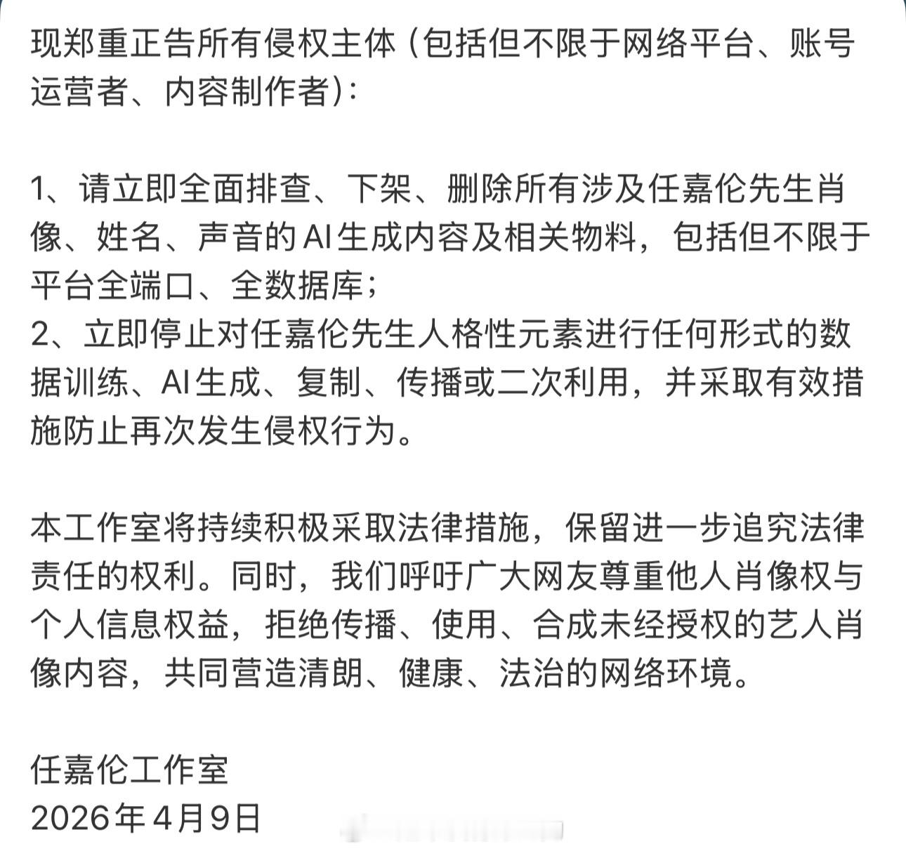任嘉伦工作室发声明抵制AI侵权肖像严禁抵制AI支持任嘉伦维护自己的合法权益任嘉伦