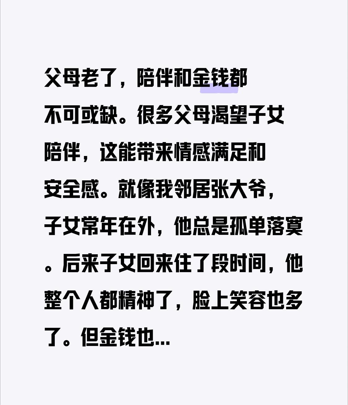 其实陪伴和金钱相辅相成。有条件的话,既给父母经济保障,又多花时间陪他们,才是最好的。不同家庭要根据实际情况平衡二者,让父母安享晚年。