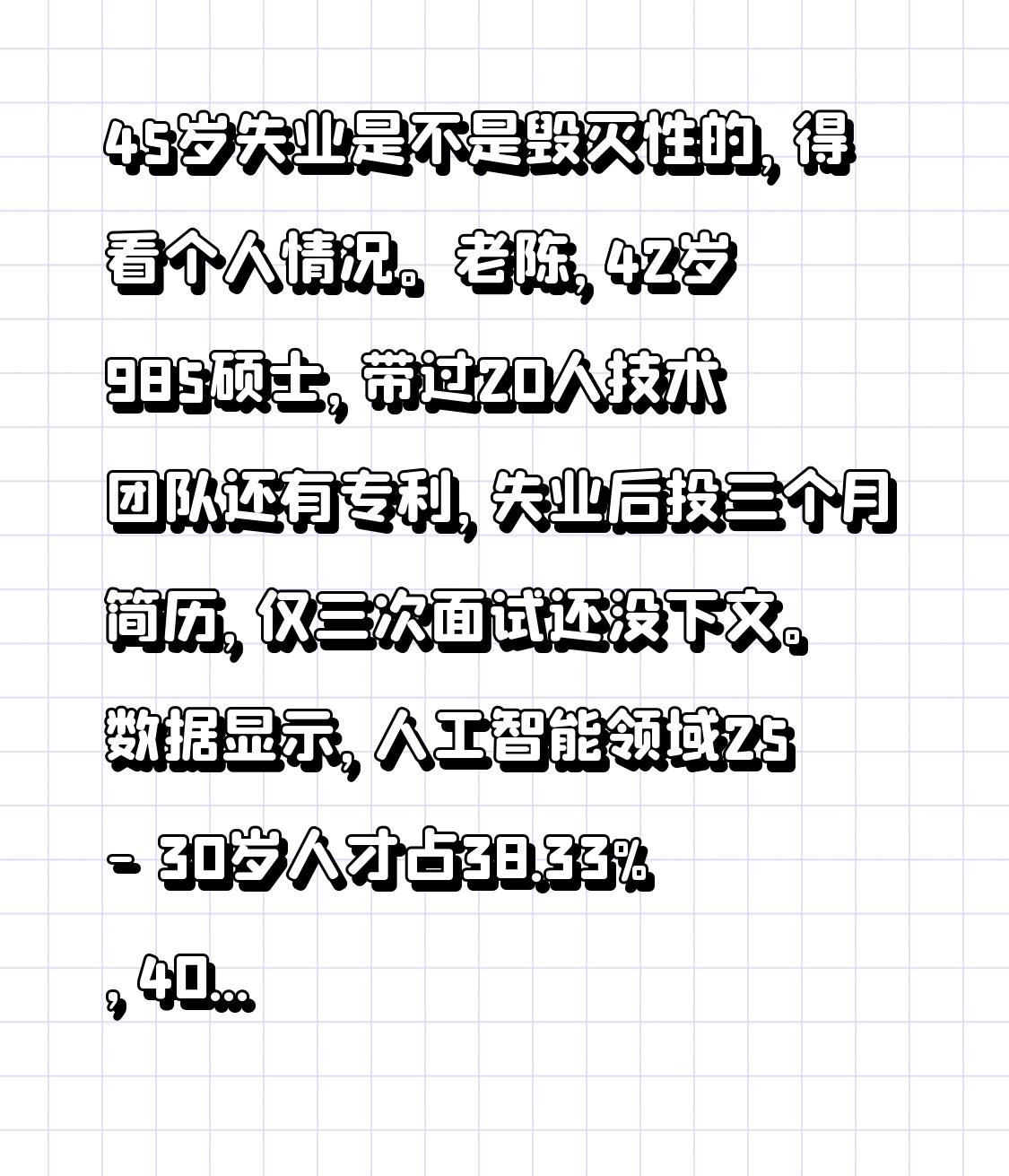 45岁失业是不是毁灭性的,得看个人情况。老陈,42岁985硕士,带过20人技术团队还有专利,失业后投三个月简历,仅三次面试还没下文。数据显示,人工智能领域25 - 30岁人才占38.33%,40岁以上不到5%,45岁以上中高级管理人员再就业难。
