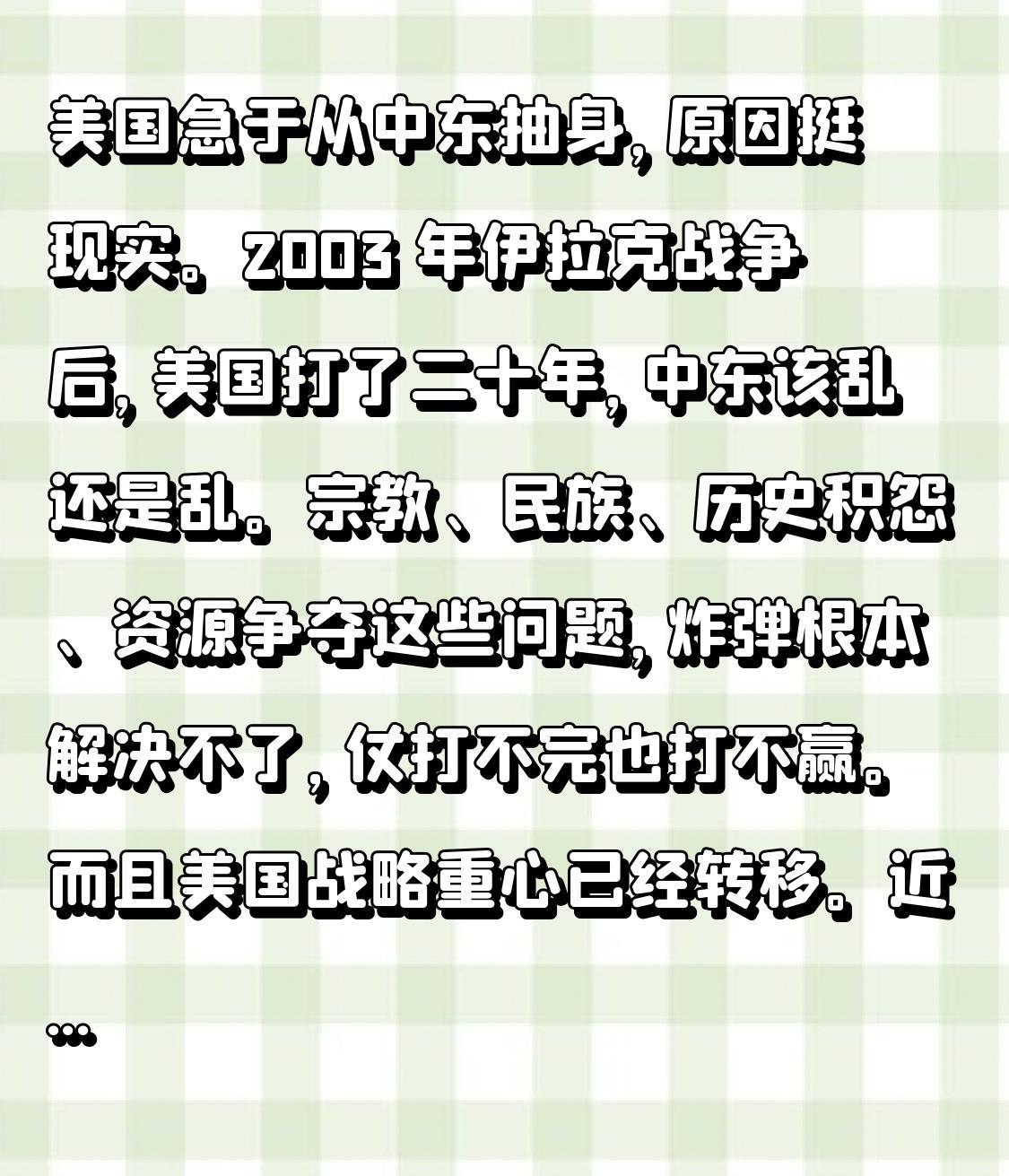 美国急于从中东抽身,原因挺现实。2003 年伊拉克战争后,美国打了二十年,中东该