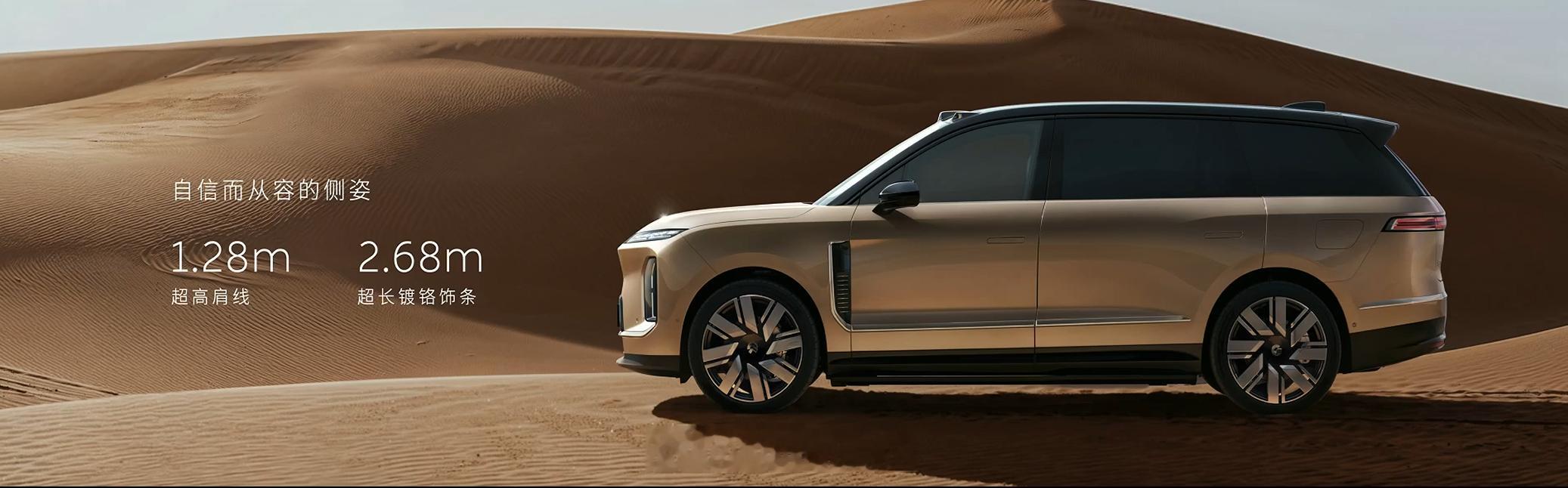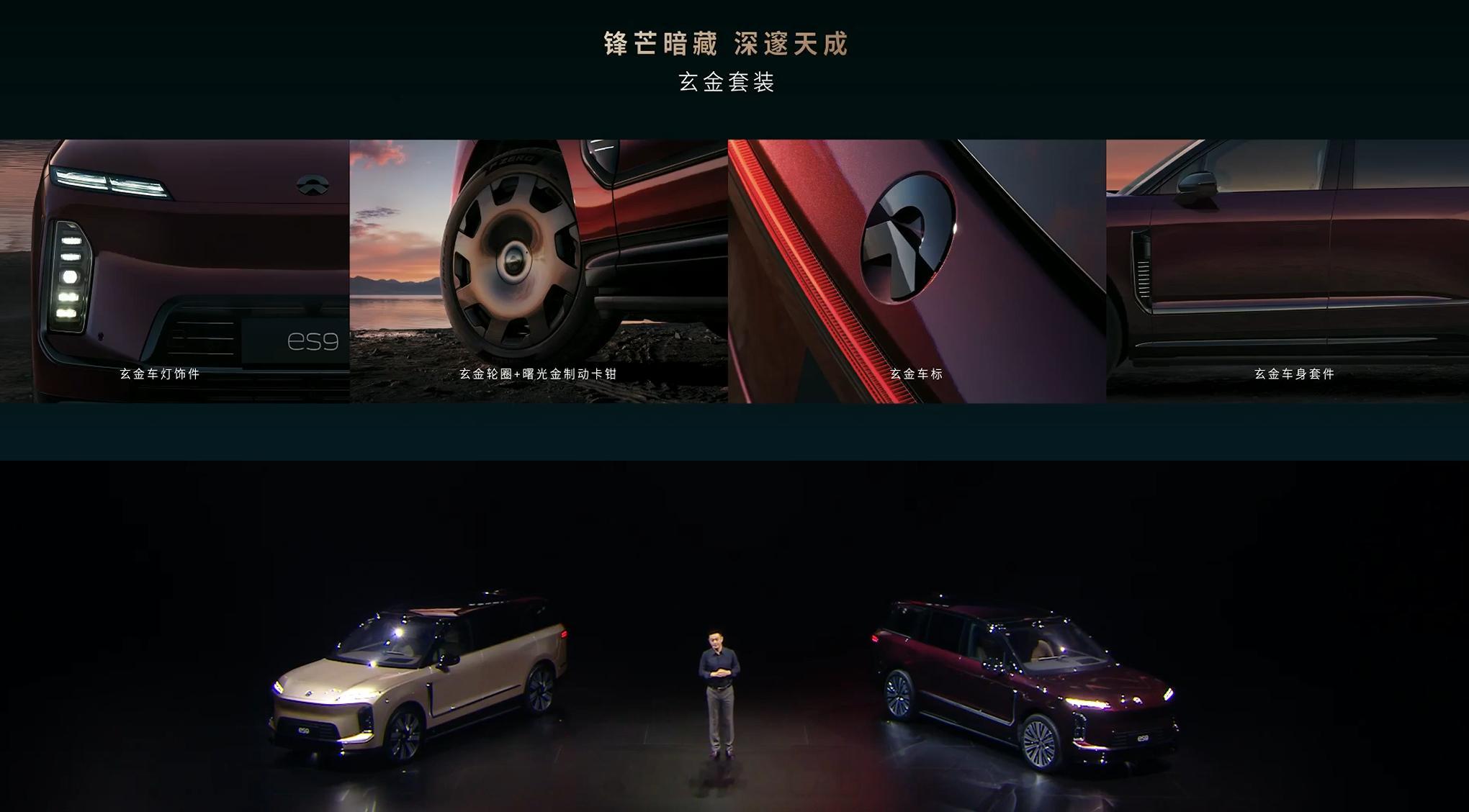 蔚来 ES9 提供 7 种车身颜色,晨晖金、云白、月辉银、M42 星云红、南极星蓝、星辰、极夜黑,可以选配玄金套装。
