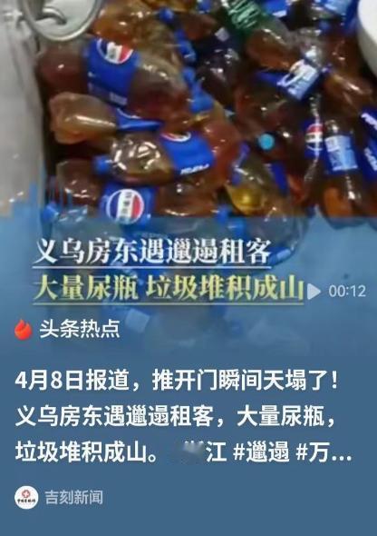 太离谱了!义乌,40多岁的男子,在租的房子里放了几千斤的尿液,全是一瓶一瓶装的,衣柜里和床底下全部摆满了。他欠房东5000元不给,房东才上门,想改密码,结果才发现这糟糕的一幕。而墙壁和空调也被男子吸烟后熏黄了,房东直言,几十年了,从来没有遇到过如此邋遢的租客。事后一定要让他把房租补齐,还要出500元的清洁费用。