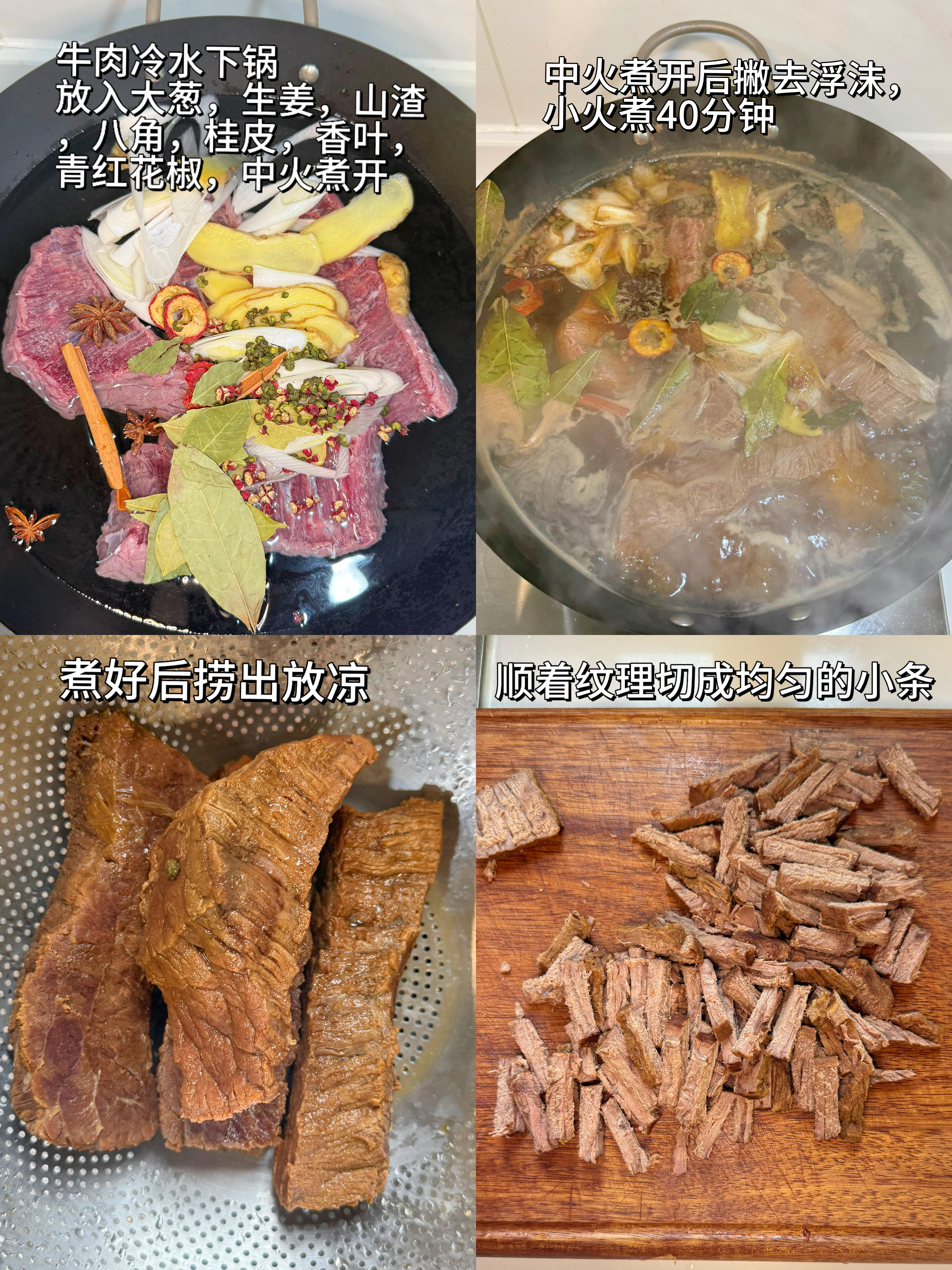 3. 牛肉煮好后,捞出放在一边放凉,一定要凉透后,顺着牛肉的纹理切成细小的条状,这样切出来的牛肉更有嚼劲,不容易散