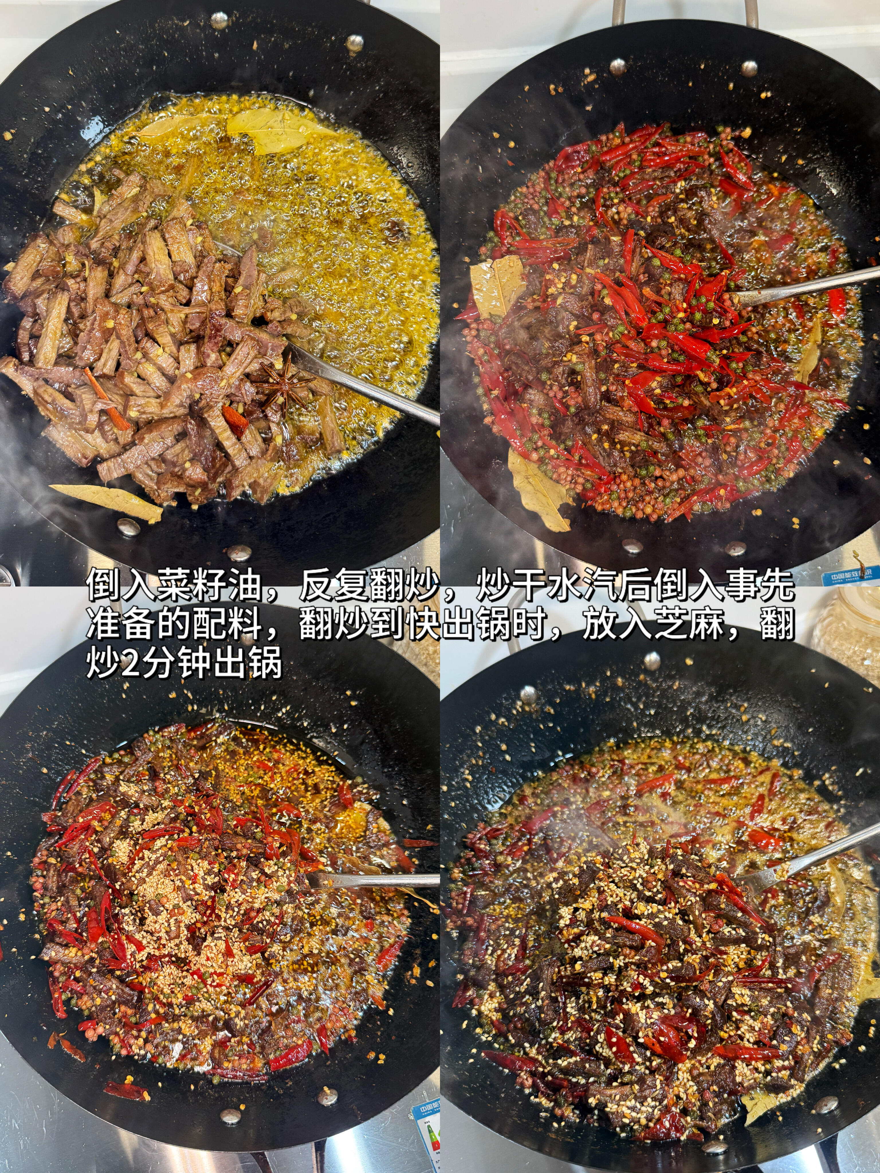 5. 炒至牛肉条微微焦香,快要出锅的时候,再撒入少许孜然粒、花椒粉和白芝麻,翻炒几下,关火盛出,放凉后食用,香辣入味、越嚼越香的冷吃牛肉就完成啦!