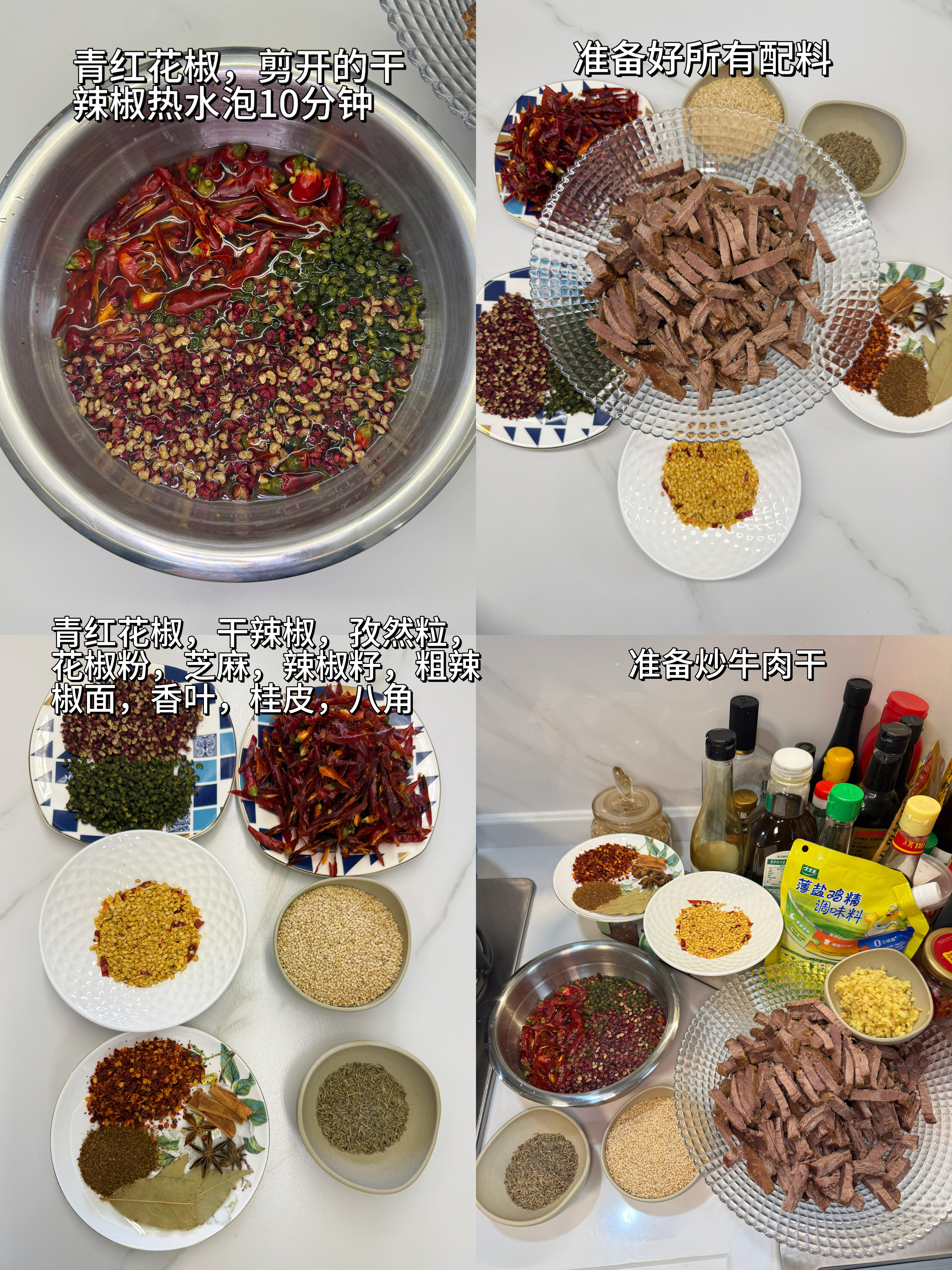 1. 牛肉提前用清水泡10分钟(嫌麻烦也可以不泡,不影响口感);青红花椒和剪好的干辣椒,用热水泡上备用,这样炒的时候更出香,还能减少辛辣感