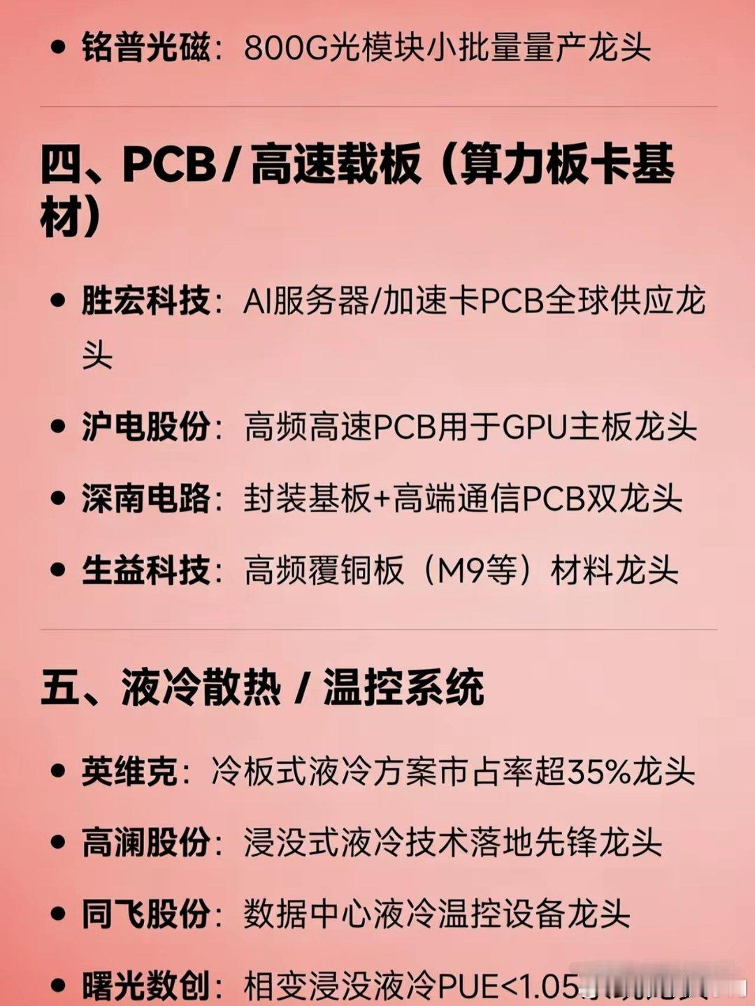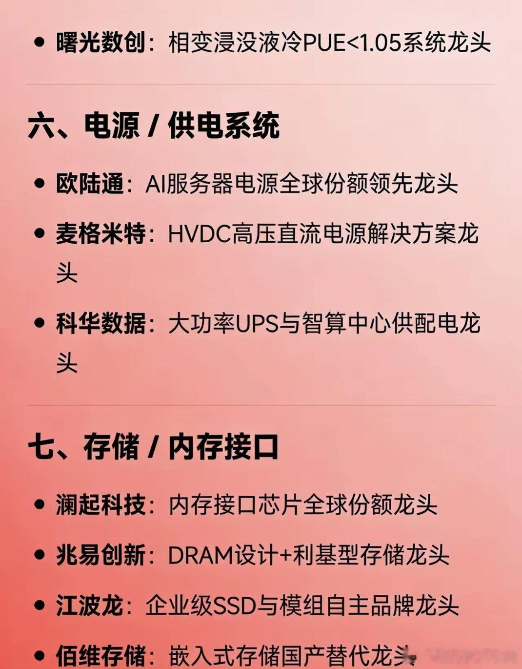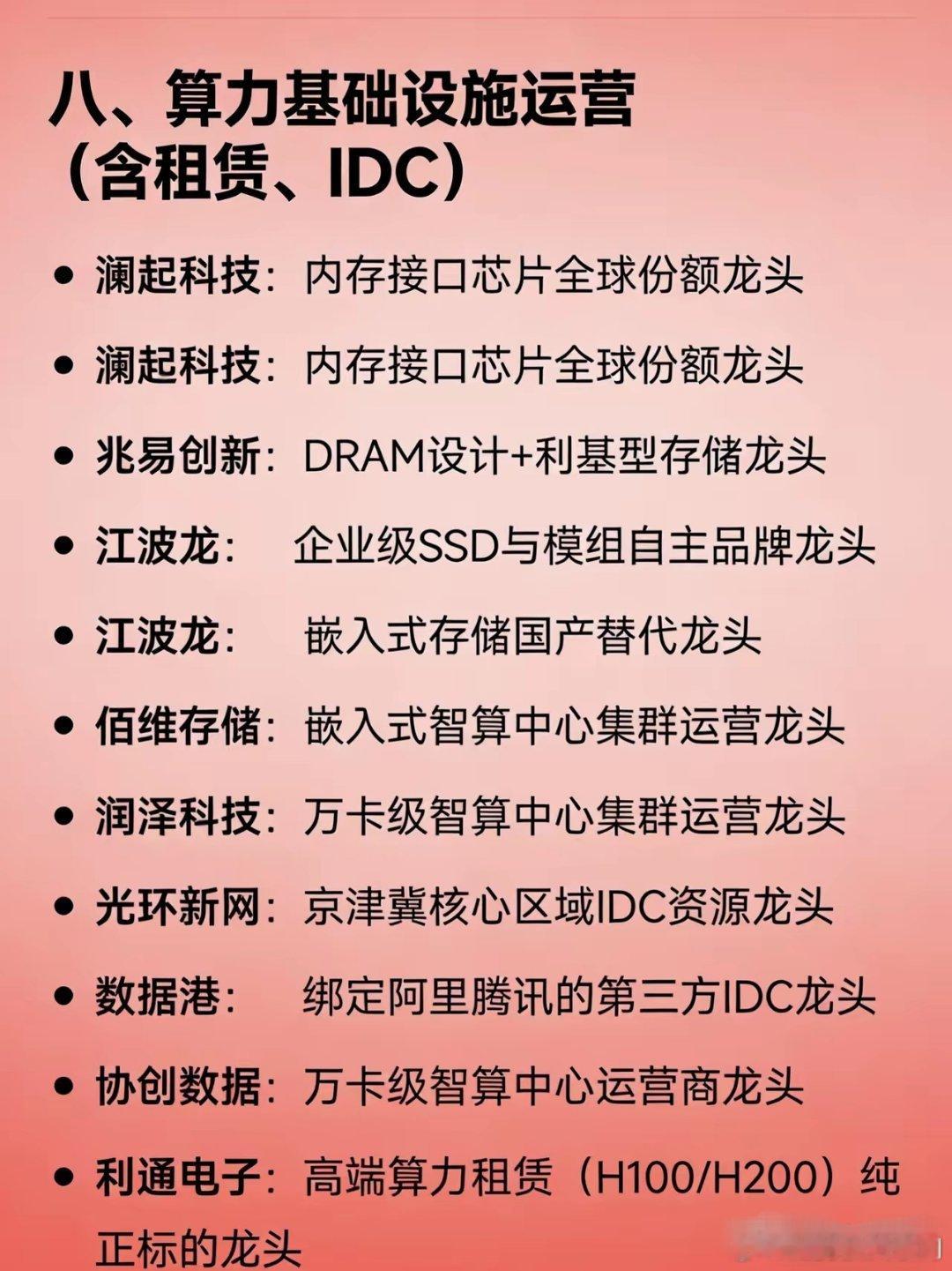 算力硬件全产业链龙头汇总一、AI/算力芯片寒武纪、海光信息、龙芯中科、景嘉微、沐曦股份二、AI服务器/智算整机工业富联、浪潮信息、中科曙光、紫光股份、神州数码、拓维信息三、高速光模块/光互联中际旭创、天孚通信、新易盛、光迅科技、源杰科技、铭普光磁四、PCB/高速载板胜宏科技、沪电股份、深南电路、生益科技五、液冷散热/温控英维克、高澜股份、同飞股份、曙光数创六、电源/供电系统欧陆通、麦格米特、科华数据七、存储/内存接口澜起科技、兆易创新、江波龙、佰维存储八、算力运营/IDC润泽科技、光环新网、数据港、协创数据、利通电子免责声明:内容整理自公开信息,仅供参考,不构成投资建议。