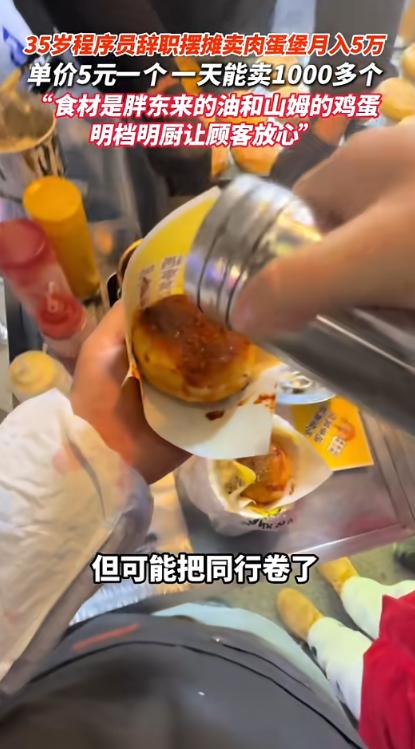 北京,一程序员因工作压力大,选择辞职,他没有继续干同一行的工作,反而开始摆摊卖起了自己爱吃的肉蛋堡,没想到生意火爆,5块钱一个的东西,却让他月入5万左右,并且越做越大,都准备开分店了!网友:条条大路通罗马!