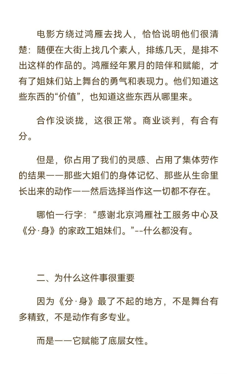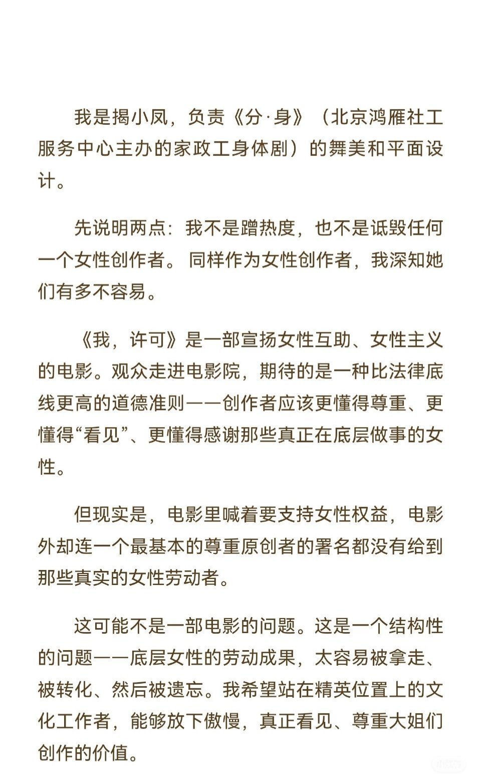 听说最近热播的文淇、秦海璐新电影《我,许可》被指疑似侵权鸿雁社工的舞台剧《分 ·