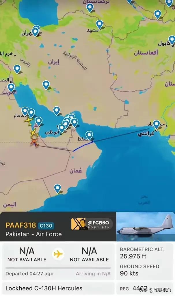 开源飞行数据直接扒出了巴军的行动轨迹。两架无呼号的伊尔-78MP加油机现身巴林东侧海湾上空盘旋,后方紧跟的极有可能是巴军王牌JF-17“枭龙”战斗机。而在更敏感的伊朗班达尔阿巴斯上空,巴军战机已实弹上岗,为伊朗代表团专机贴身护航。为了确保万无一失,巴军直接砸出了家底:2架预警机升空建立绝对雷达警戒网,4架C-130H运输机满载人员和物资紧急降落沙特阿卜杜勒-阿齐兹空军基地。