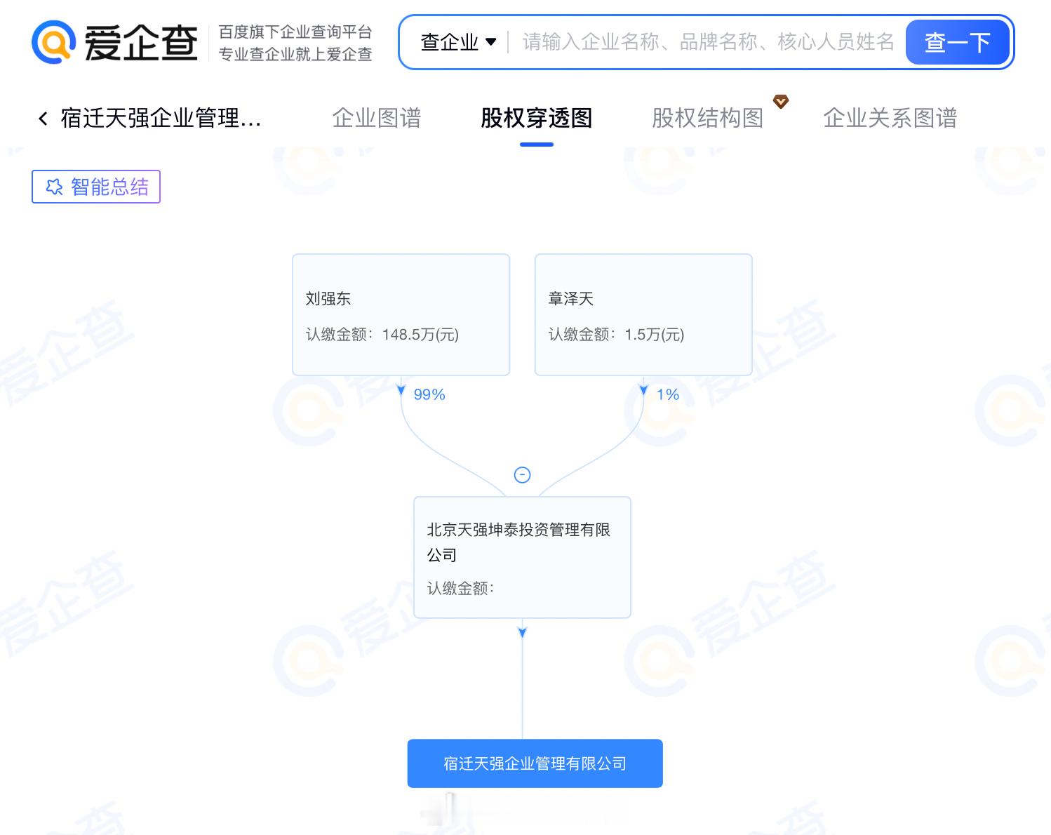 股权穿透图显示,该公司由北京天强坤泰投资管理有限公司全资持股,后者由刘强东、章泽天共同持股。