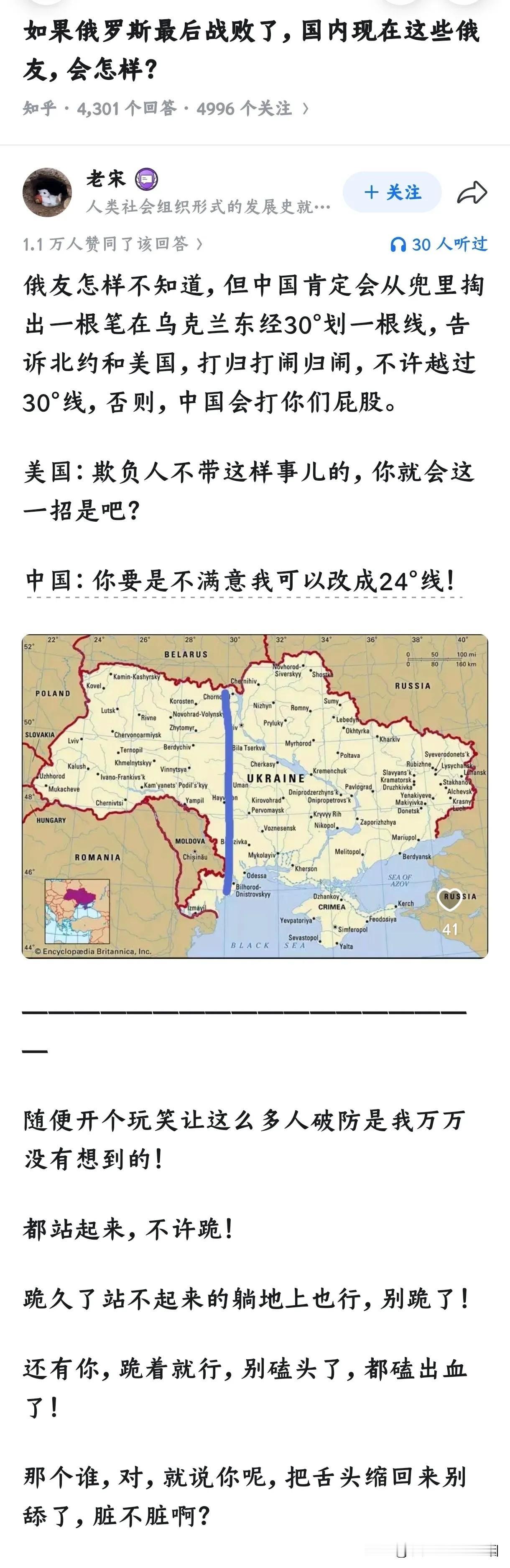 再说大鹅如果有了败象,说什么东经30度是不可能,画个俄乌边境线,已经是极限,难道还要画乌克兰家里,这不符合事实?
