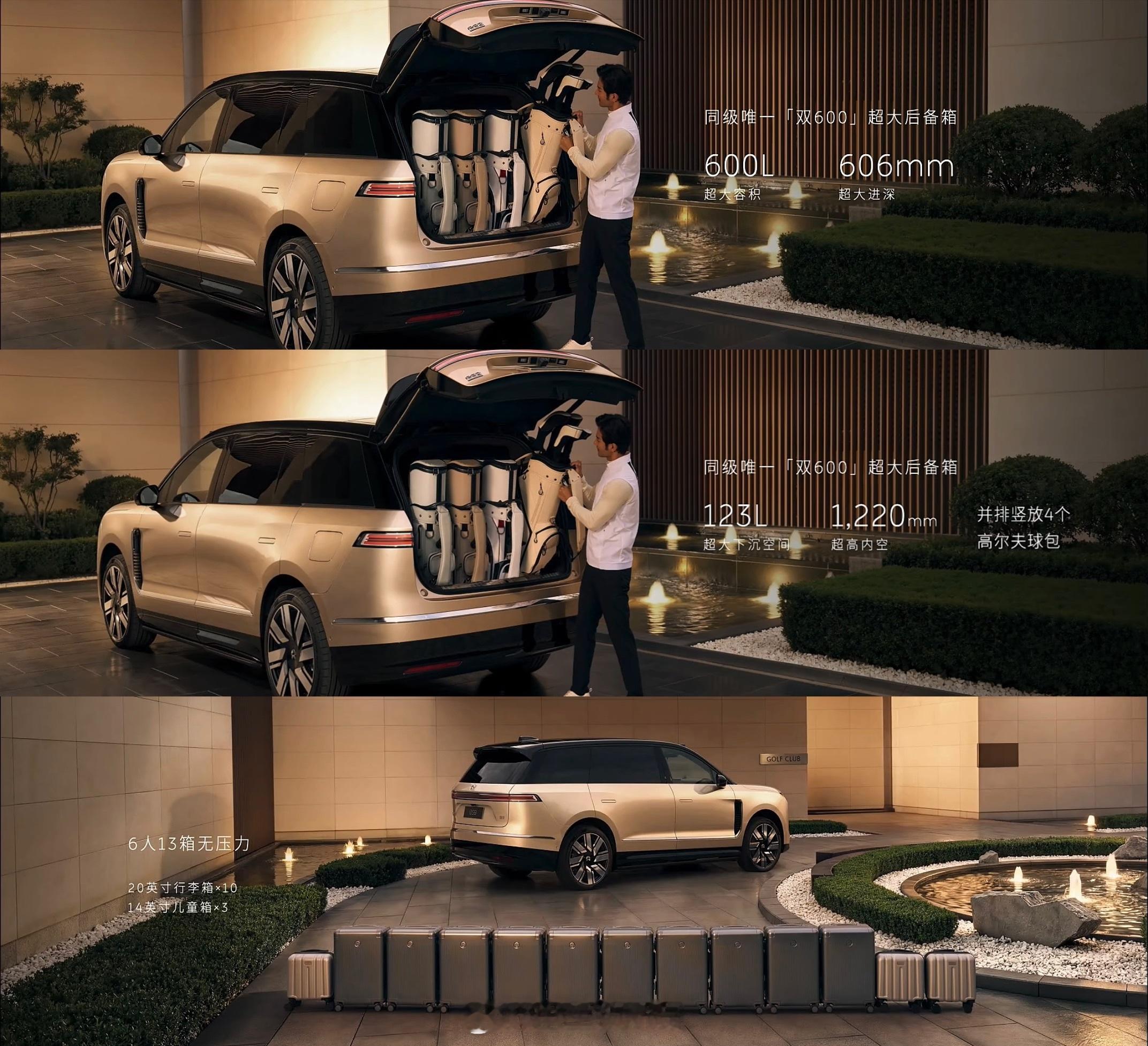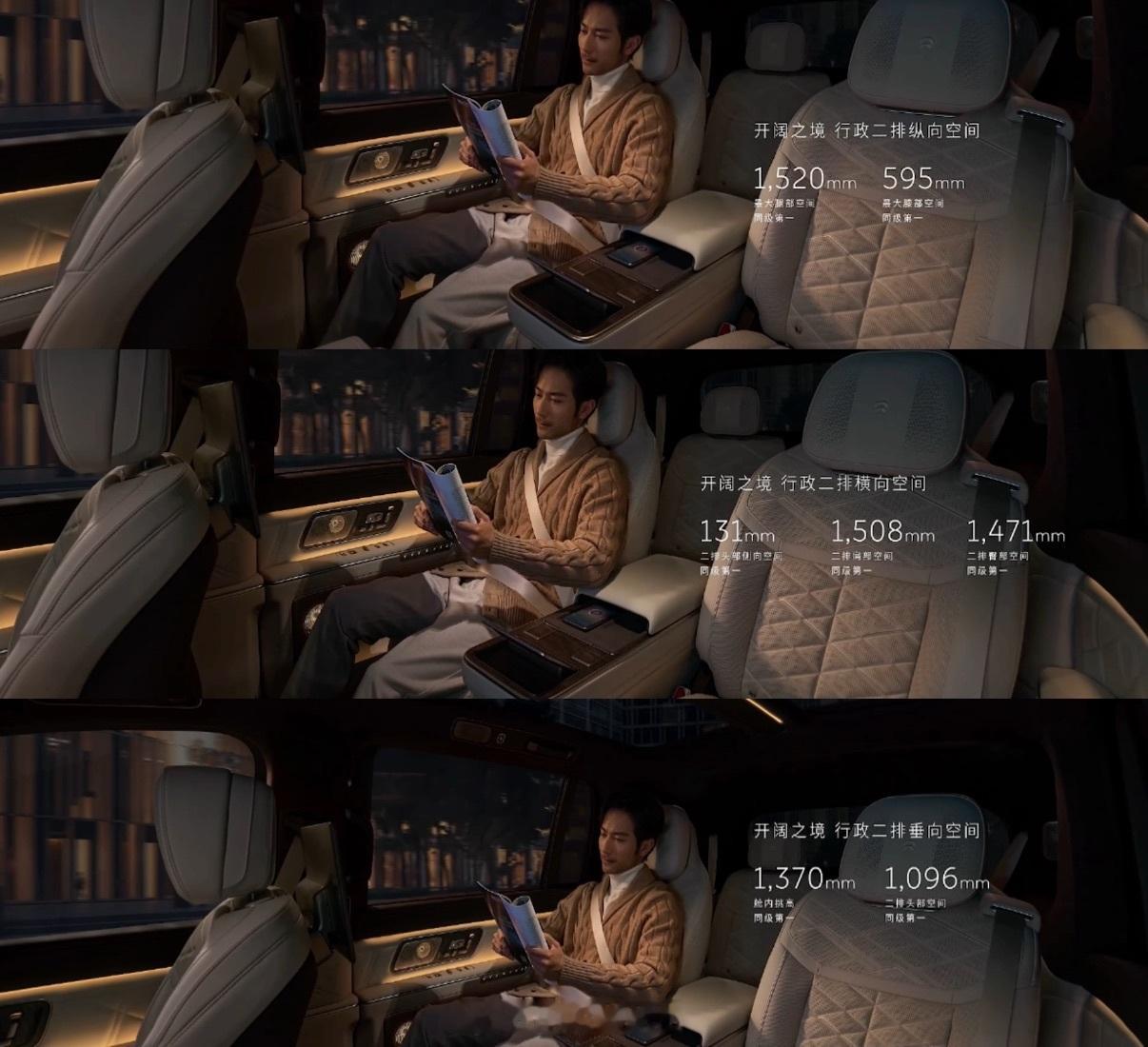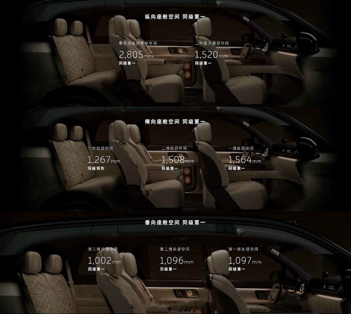 1️⃣车长5365,高度1870,内部空间绝对领先。2️⃣三排超大六座,每一个座位都宽敞。3️⃣座座都宽大豪华,座座都是MVP。4️⃣前备舱+后备箱容积超过810L,6人13箱。5️⃣全主动悬挂,提供顶级舒适性。6️⃣天空岛设计开扬感更强,还有极致的隐私性。7️⃣精心设计的储物收纳,取放都从容优雅。