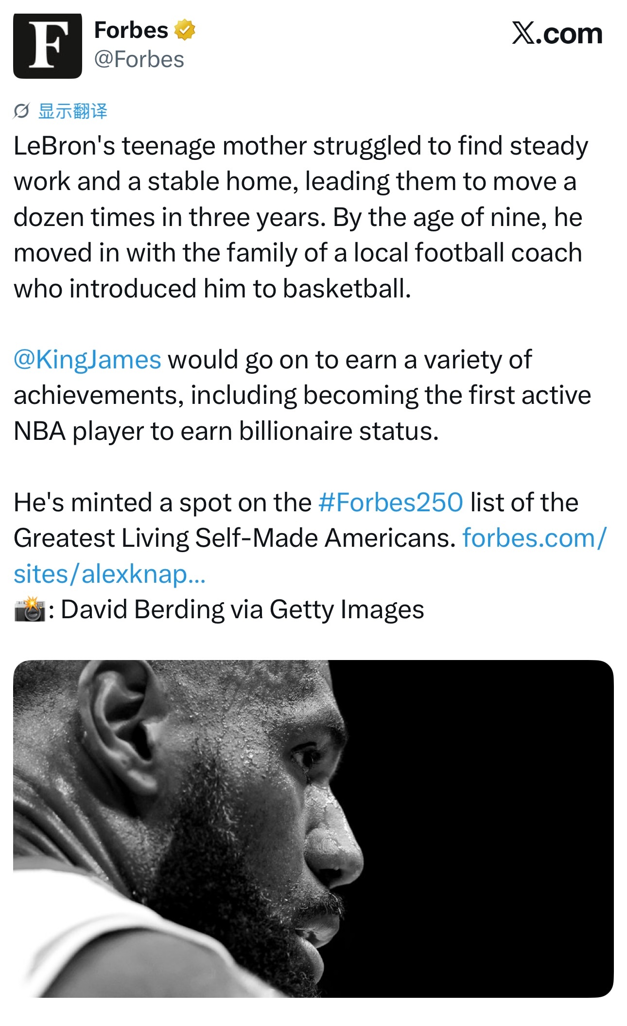 福布斯杂志评选美国250位白手起家的在世亿万富翁,詹姆斯排在第五,评语是: