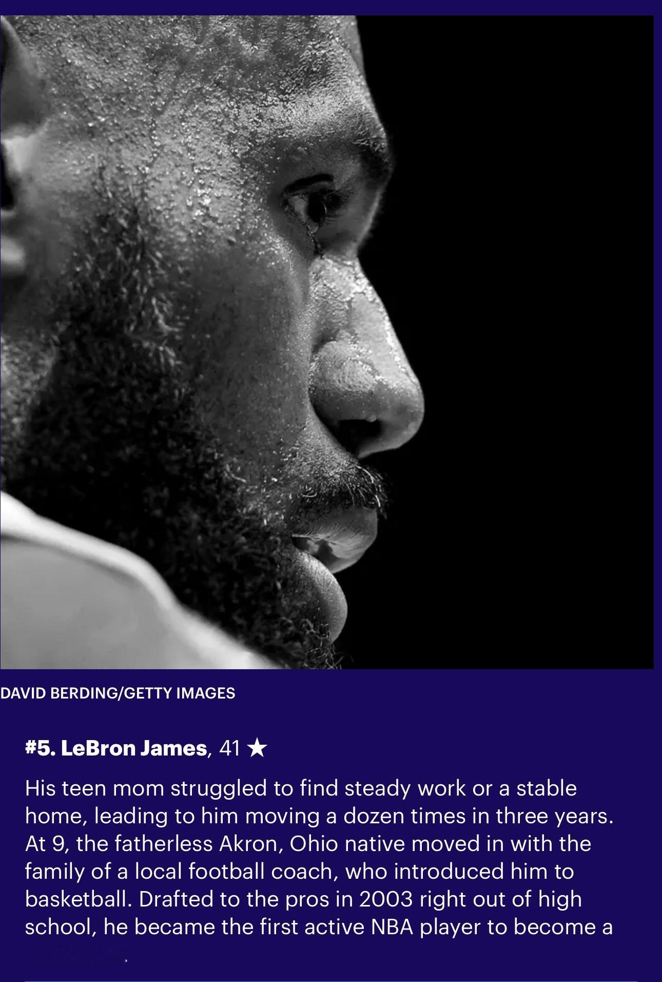 他的母亲在青少年时期便难以找到稳定的工作与住所,致使他在三年间辗转搬迁十余次。9岁时,这位自幼丧父、来自俄亥俄州阿克伦的少年,寄宿于当地一位橄榄球教练家中,正是这位教练引导他接触了篮球。2003年,他以高中生身份直接入选职业联赛,成为NBA历史上首位在役期间身家突破10亿美元的球员,并且取得了一系列辉煌成就。