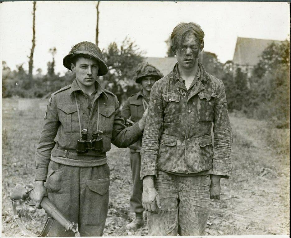 英国伞兵与第12党卫军装甲师“希特勒青年团”被俘军人合影,被俘军人员均穿着豌豆绿迷彩服,该服装仅限党卫军精锐使用,被视为二战德军最成熟、隐蔽效果最佳的迷彩之一,其斑点设计理念影响深远,对战后多国迷彩均有启发。