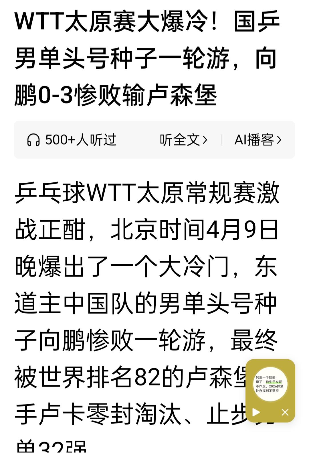 樊振东因个人原因,自愿放弃参加伦敦世乒团体赛,昨天太原挑战赛,头号种子单打国乒选手向鹏,被世排名82位的卢森堡运动员卢卡0:3击败一轮游,众人看后立马对伦敦世乒团体赛,国乒男队的夺冠形势感觉心里凉哇哇的,谁能助伤病缠身的王楚钦一臂之力,夺得救命的1分呢!是″内战王″周启豪,还是状态低迷的林诗栋,还是老态龙钟的梁靖崑?!!