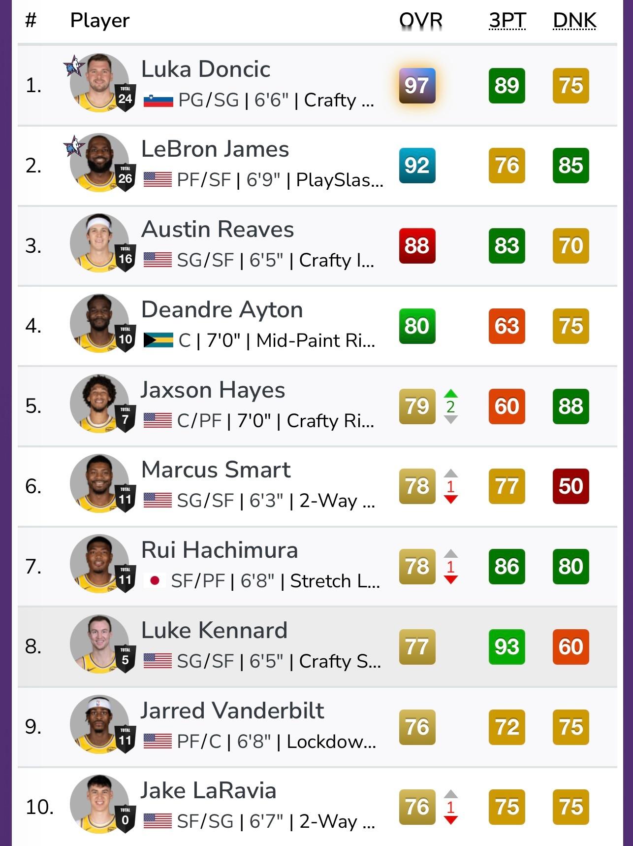 海斯79(+2)斯玛特78(-1)八村垒78(-1)拉拉维亚76(-1)布朗尼71(+1)
