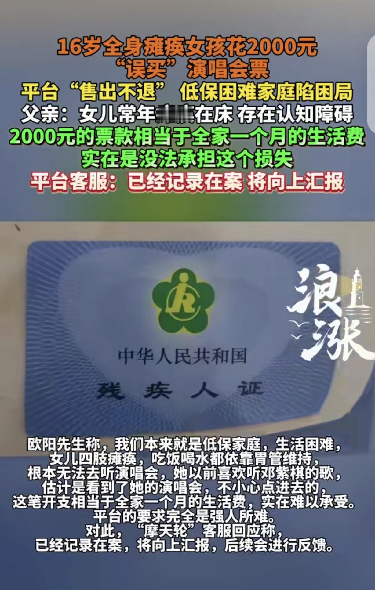 “崩溃了!”一16岁全身瘫痪女孩,花2000元,“误买”某明星演唱会门票,父亲发现后,立马进行退票,可平台却说:售出不退,除非让法院提供你女儿没民事行为能力证明。父亲崩溃:我们是低保困难家庭,2000元相当于全家一个月生活费。网友:误买?这概率比我误赚200亿概率还低!