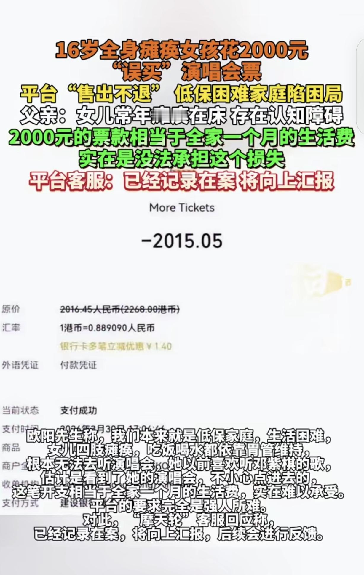 “崩溃了!”一16岁全身瘫痪女孩,花2000元,“误买”某明星演唱会门票,父亲发