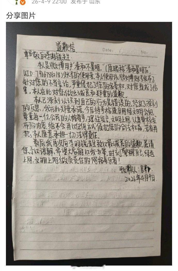 李昀锐告黑胜诉,黑粉手写道歉信道歉!网络绝非法外之地,支持小林用法律捍卫权益!
