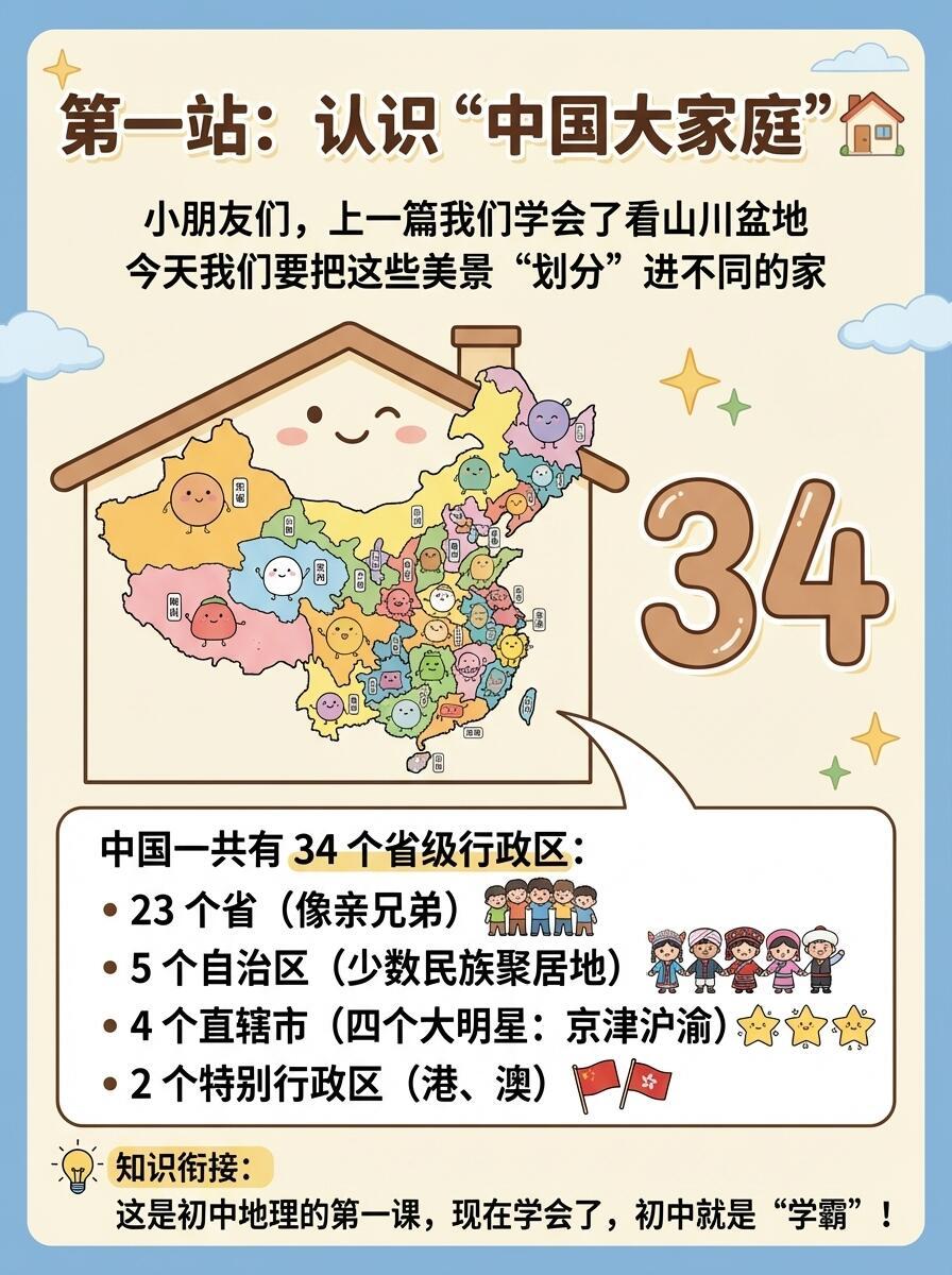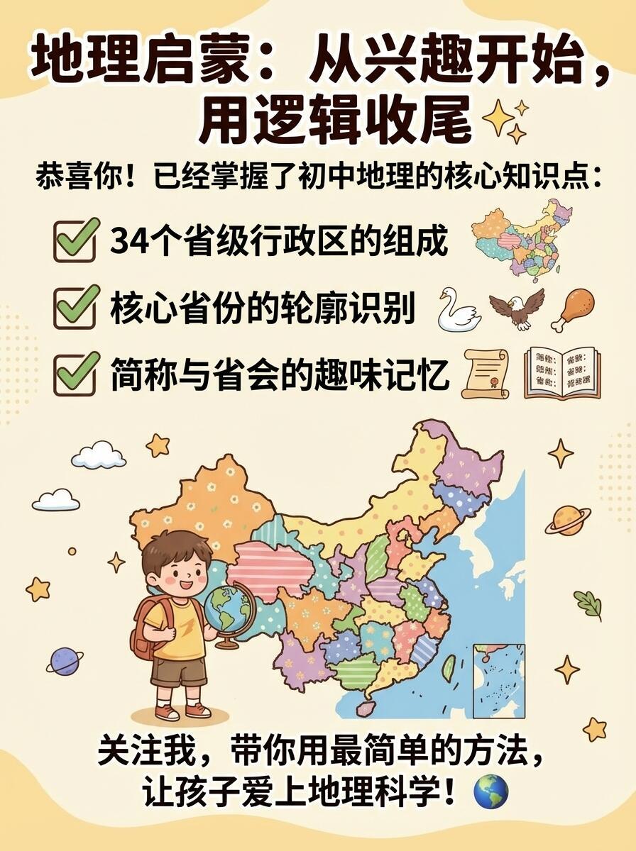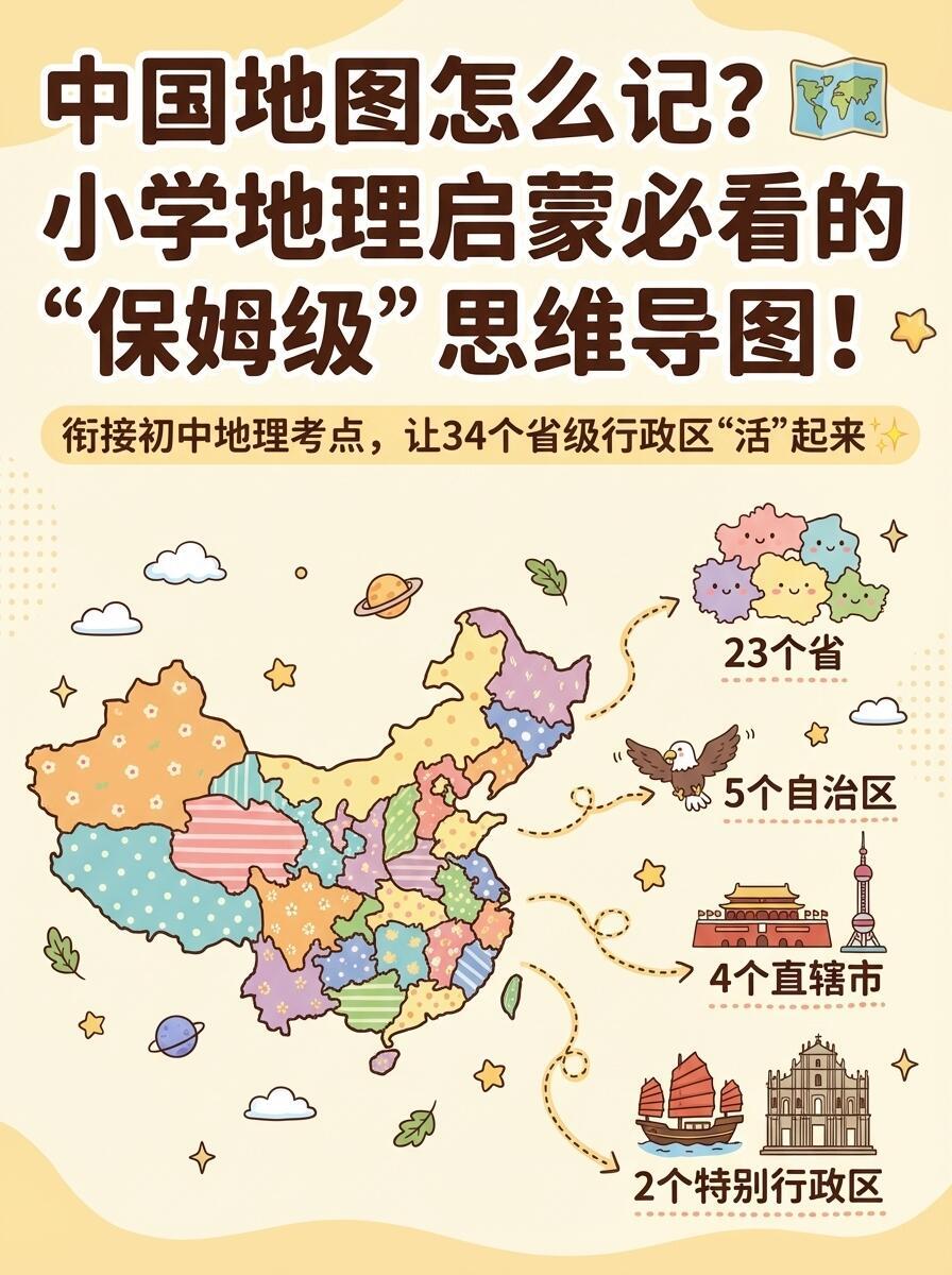 地理启蒙,34个省份秒记指南。不用死记硬背,一张思维导图,从小学无缝衔接初中考点