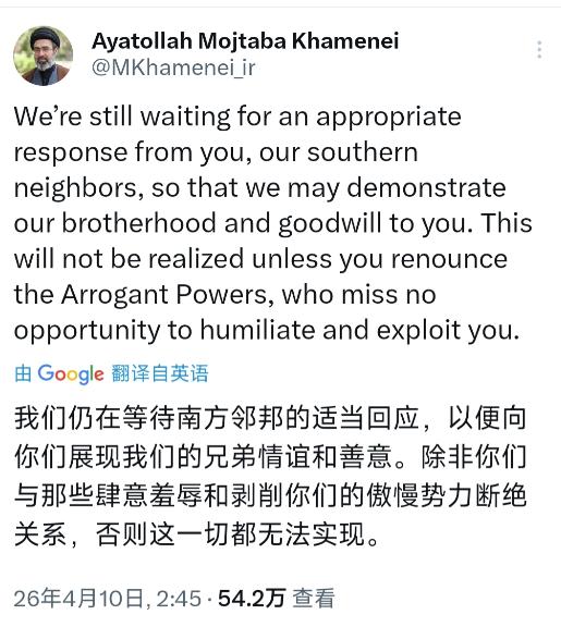 伊朗最高领袖穆杰塔巴·哈梅内伊北京时间4月10日的表态“我们仍在等待南方邻邦的适当回应,以便向你们展现我们的兄弟情谊和善意。除非你们与那些肆意羞辱和剥削你们的傲慢势力断绝关系,否则这一切都无法实现”,这句话不是空泛的外交辞令,而是德黑兰方面在关键节点释放的明确信号。