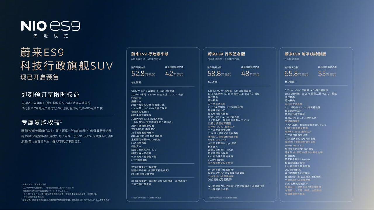 韩路:蔚来ES9预售 【行政豪华版】 整车购买:52.8万起,租电方案:42万